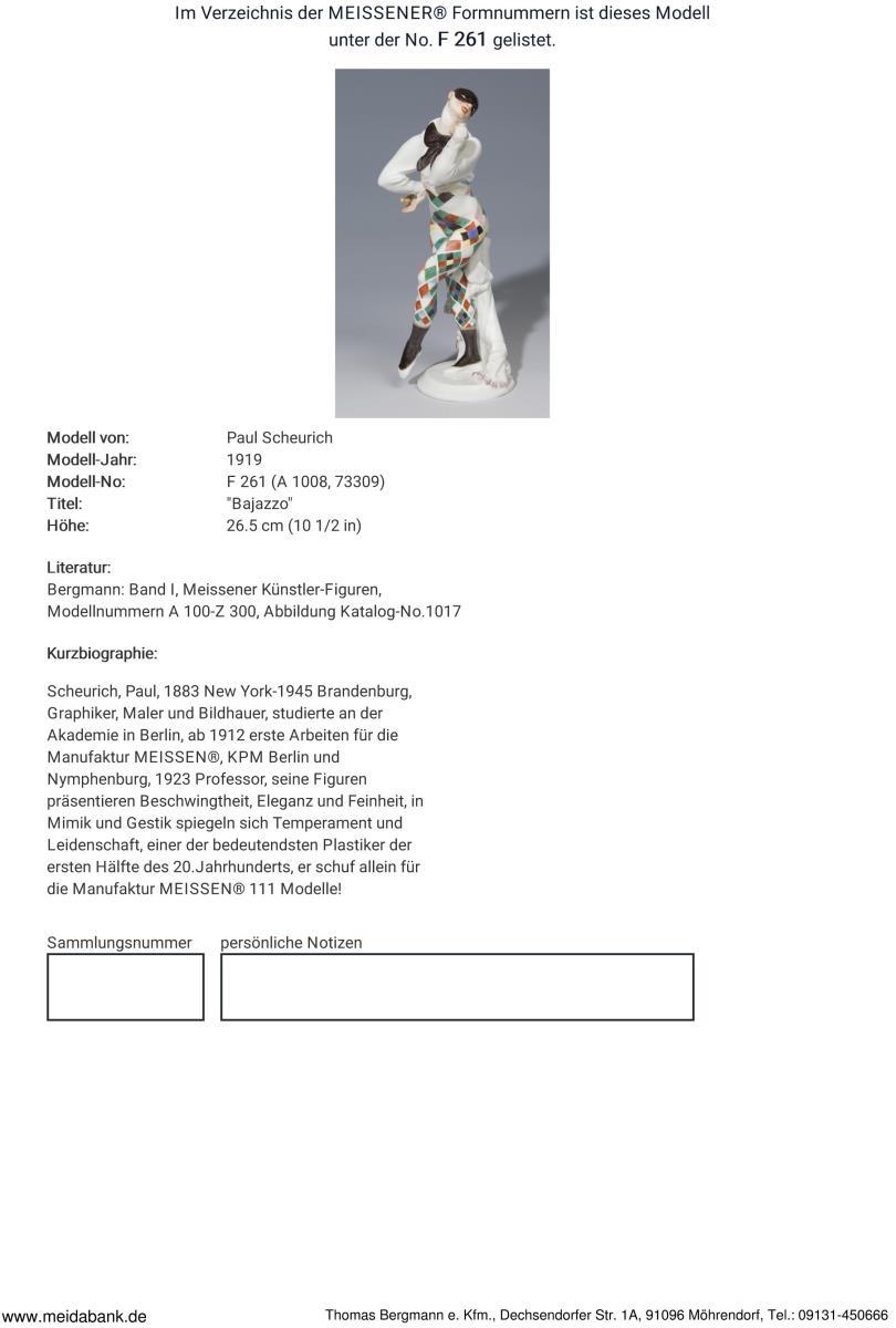 Scheurich, Graphiker, Maler und Bildhauer. Studierte an der Akademie in Berlin. Ab 1912 erste Arbeiten für Meissen. 1923 Professor. Meissen-Manufaktur-Preis: 4990,- Euro. * Partnerauktion Bergmann.