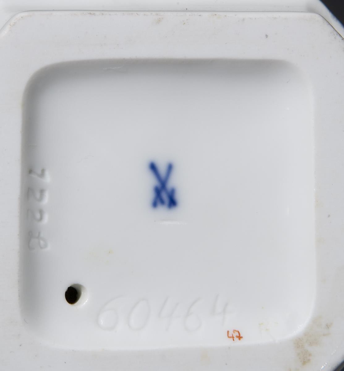 Modell von Peter Strang 1988. Farbig bemalt, gold staffiert. Ritzmarke, Pressmarke, Malermarke, Künstler-Signet, Schwertermarke einmal gestrichen. An diversen Stellen restauriert.