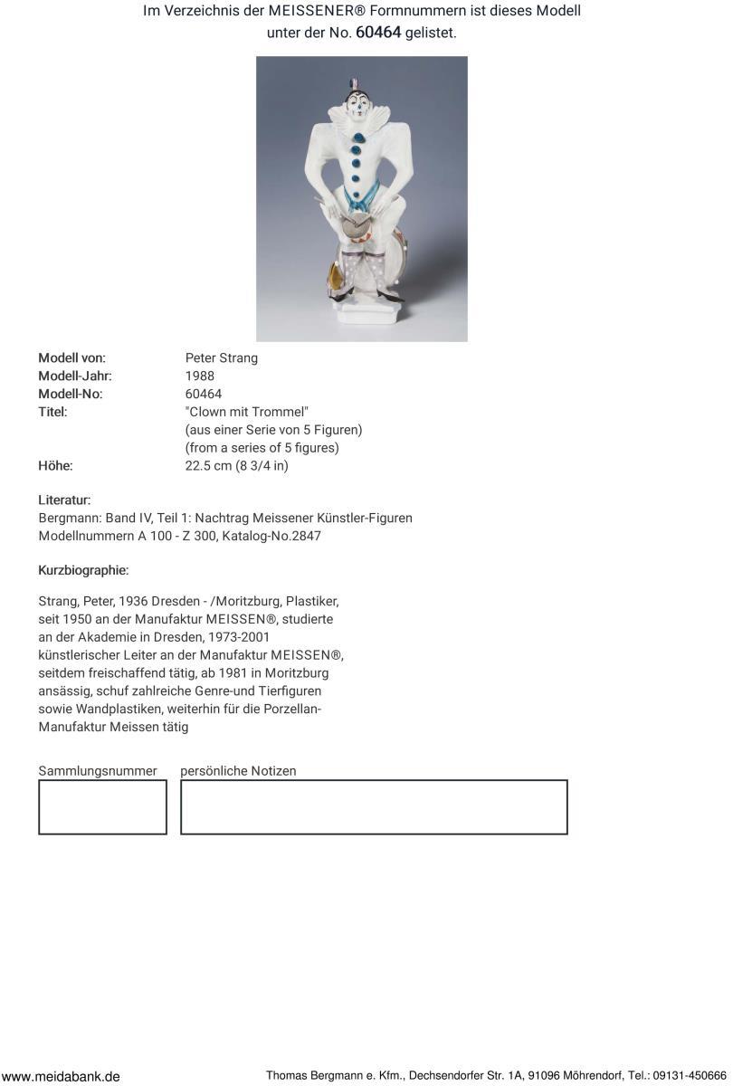 Strang, 1936 Dresden-, Plastiker. Seit 1950 an der Manufaktur Meissen. 1973-2001 künstlerischer Leiter. Seitdem freischaffend tätig. Meissen-Maunfaktur-Preis: 2290,- Euro. * Partnerauktion Bergmann.