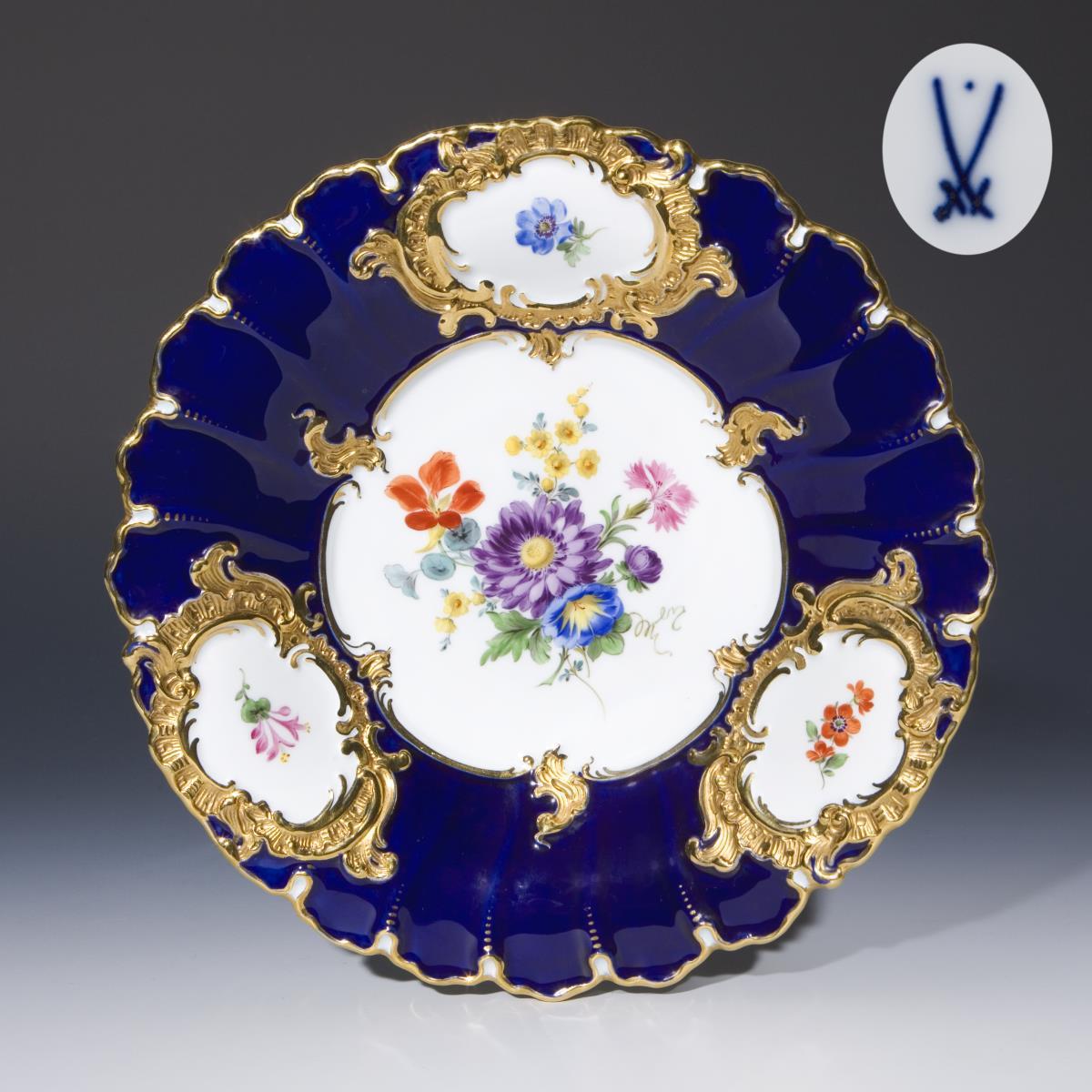 Modell von Ernst August Leuteritz 1863-1865. Reliefiert, gold staffiert, mattiert und poliert. Kobaltblauer Fond, farbige Bemalung mit Buketts und Einzelblüten. Pressmarken, Malermarke, Schwertermarke mit Punkt.