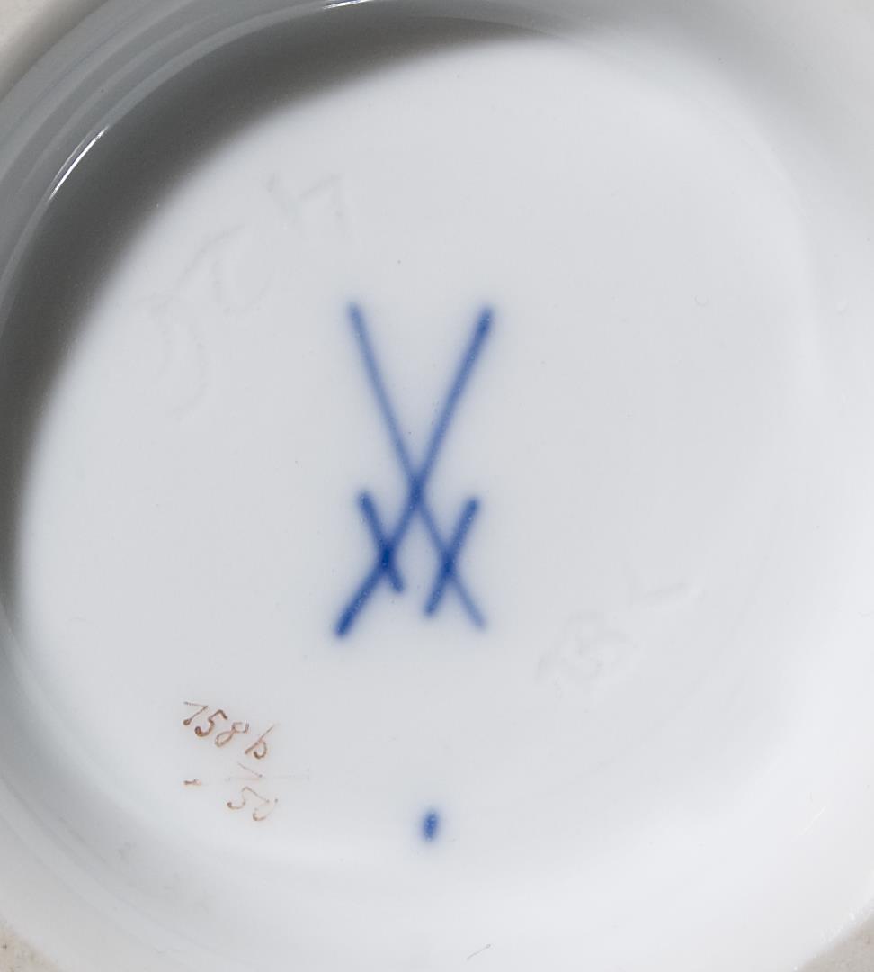 Feine farbige Bemalung. Vogel- und Insektendekor, gold staffiert. Ritzmarke, Pressmarke, Malermarke, Schwertermarke.
