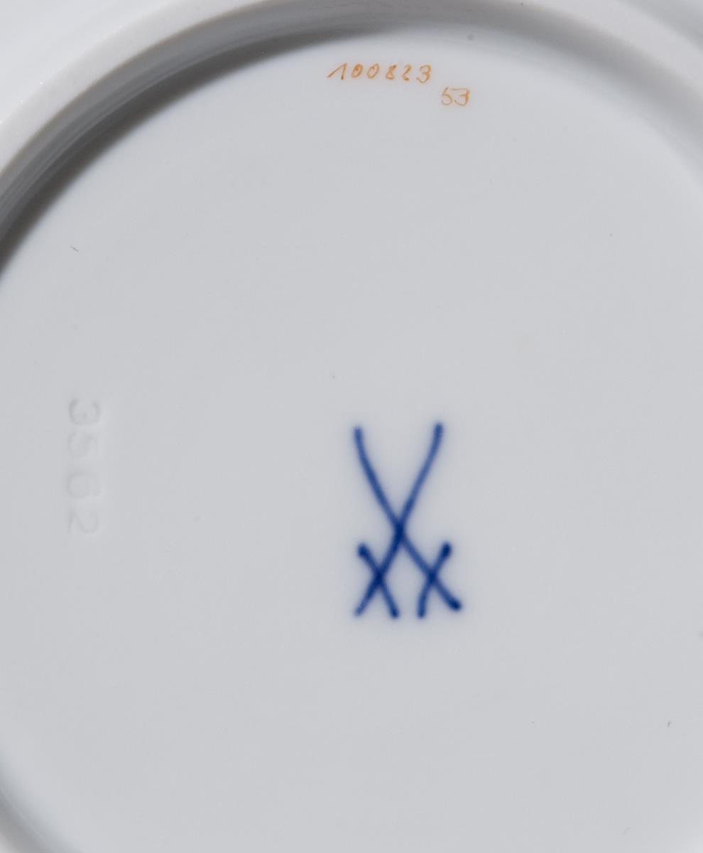 Reliefdekor "Marseille", florale kupfergrüne Camaieumalerei, goldene Zahnkanten, Goldstaffage. 33 Teile: Kaffeekanne, Milchkännchen, Zuckerdose, Bonbonniére, 2 kleine Gebäckschalen, 2 große Gebäckschalen, Tortenplatte, 8 Tassen, 8 Untertassen, 8 Dessertteller. Pressmarken, Malermarken, Schwertermarken, vier Schwertermarken einmal bis viermal gestrichen. 1 kleine Randecke an einer großen Tortenplatte geklebt.