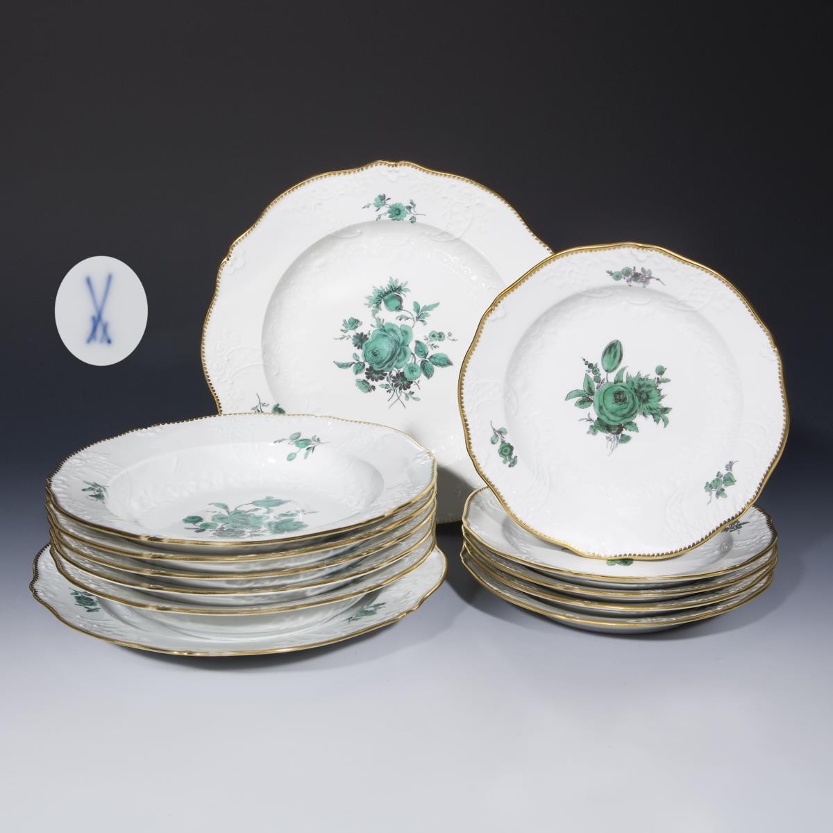 Reliefdekor "Marseille", florale kupfergrüne Camaieumalerei, goldene Zahnkanten. 2 Essteller, 5 Suppenteller, 5 Dessertteller. Pressmarken, Schwertermarken, eine Schwertermarke mit Punkt, fünf Schwertermarken einmal gestrichen.