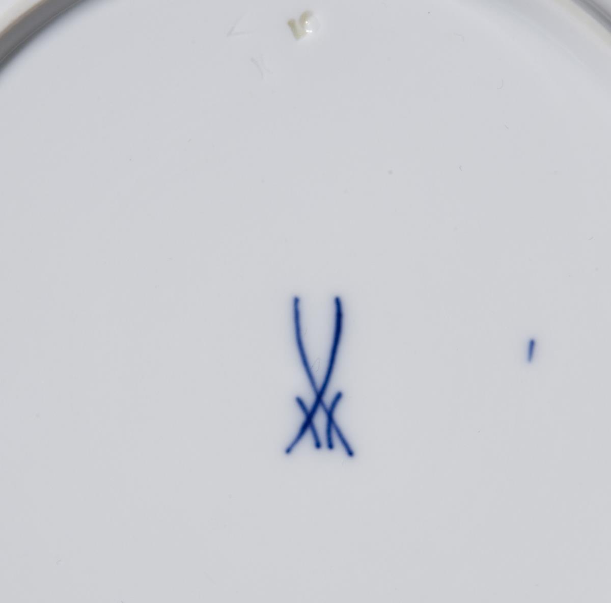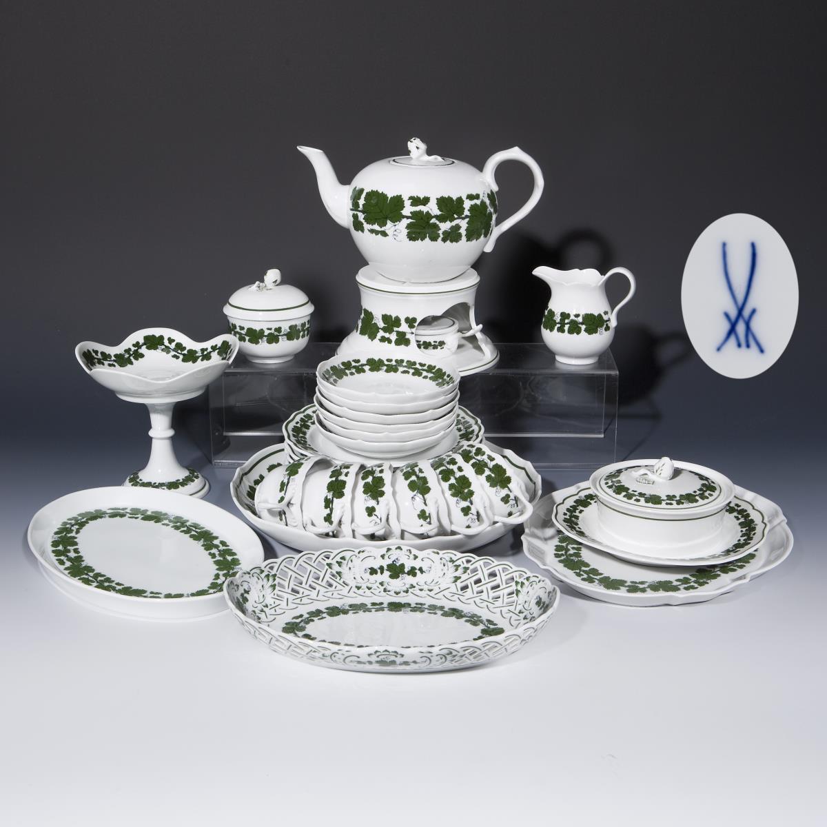 Form "Neuer Ausschnitt". 29 Teile: 1 Teekanne, 1 Rechaud, 1 Teelicht, 1 Milchkännchen, 1 Zuckerdose, 1 Fußschale, 2 ovale Platten, 1 Butterdose, 1 Durchbruchschale, 1 Gebäckschale, 6 Tassen, 6 Untertassen, 6 Dessertteller. Grüne Unterglasurbemalung. Pressmarken, Malermarken, Schwertermarken. Fünf Schwertermarken zweimal gestrichen, eine Schwertermarke mit Punkt. Eine Lippe, eine Rose minimal bestoßen.