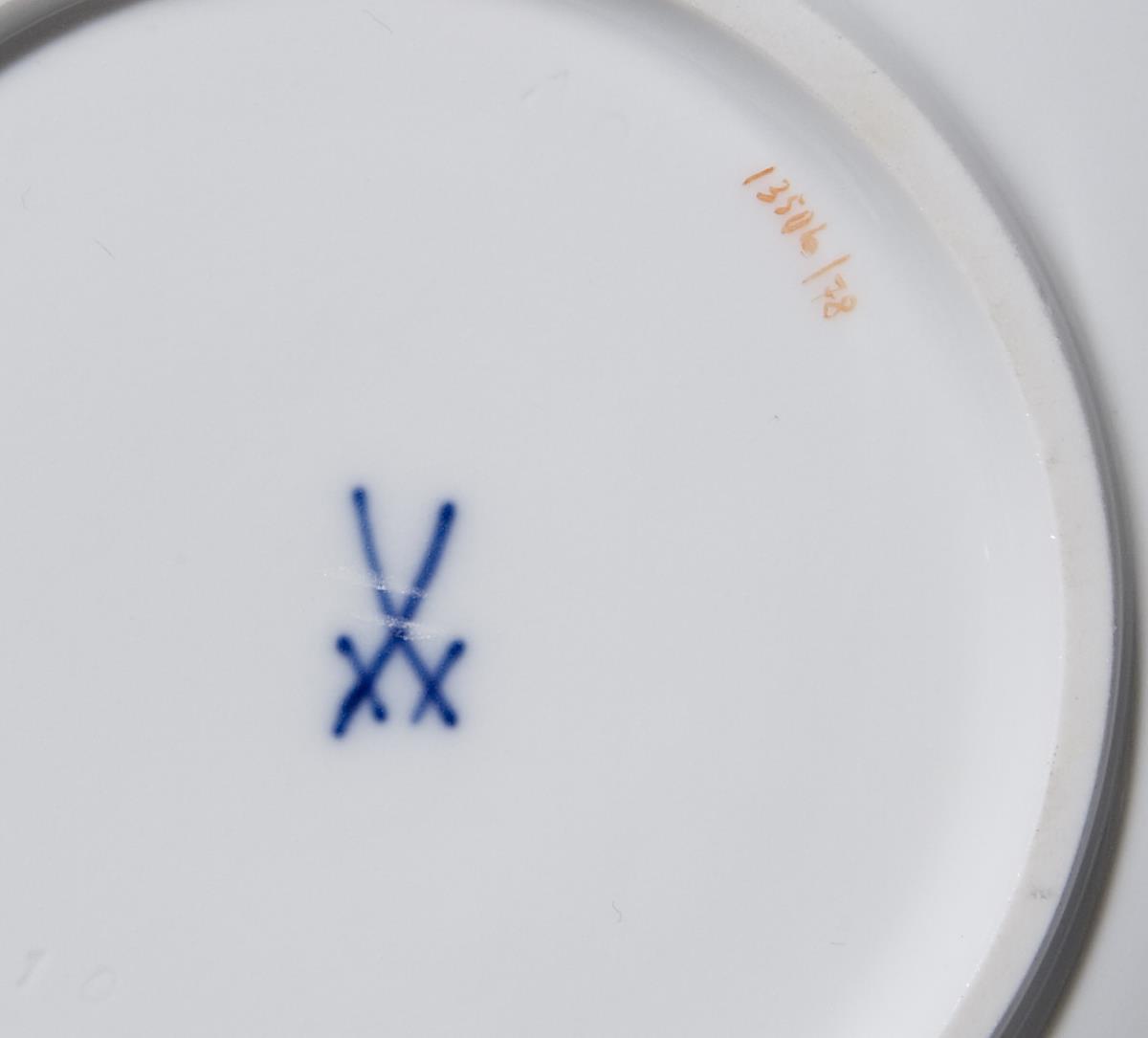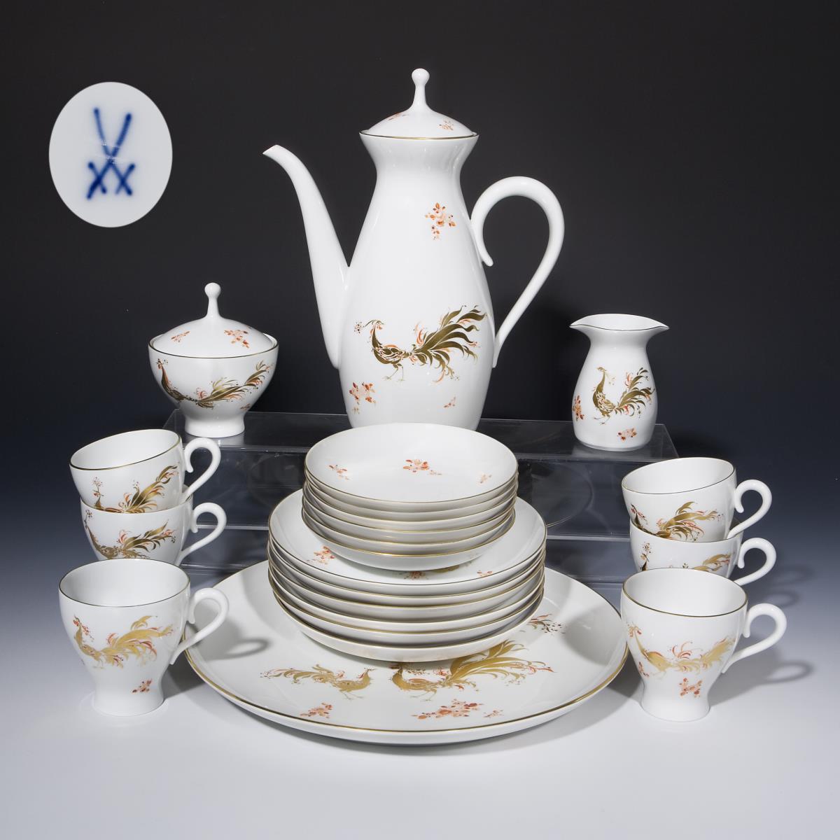 Modell von Erhard Grosser, Alexander Struck und Ludwig Zepner 1961-1963. Sogenanntes "Kollektivservice", auch als "Form 607" bezeichnet. Dekor von Heinz Werner 1965-1966 "Prachtvogel", auch "Goldvogel" oder "Fasan" genannt. Bemalung in Gold und Korallenrot, Goldstaffage. 22 Teile: Kaffeekanne, Milchkännchen, Zuckerdose, Gebäckplatte, 6 Tassen, 6 Untertassen, 6 Dessertteller. Pressmarken, Malermarken, Schwertermarken zweimal gestrichen. Zwei Tassen am Stand bestoßen.