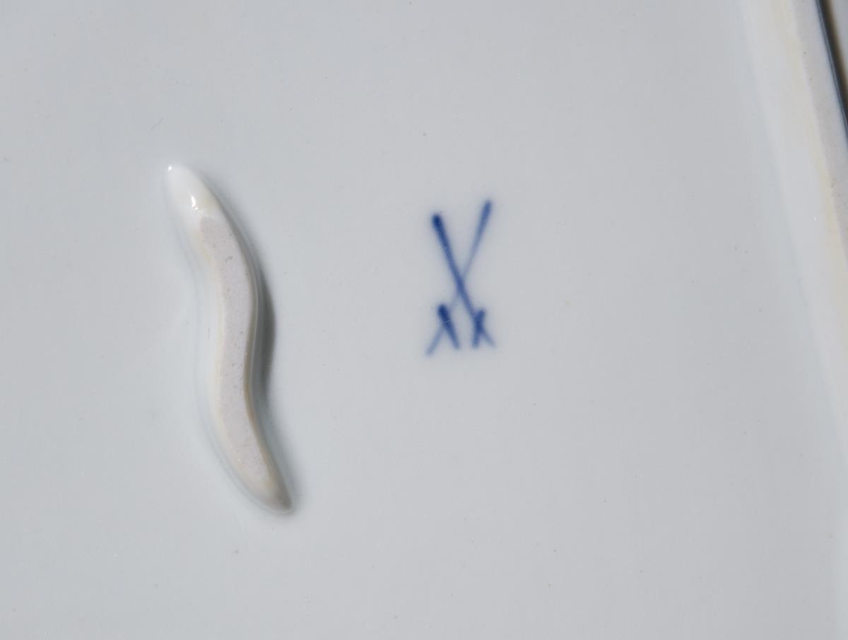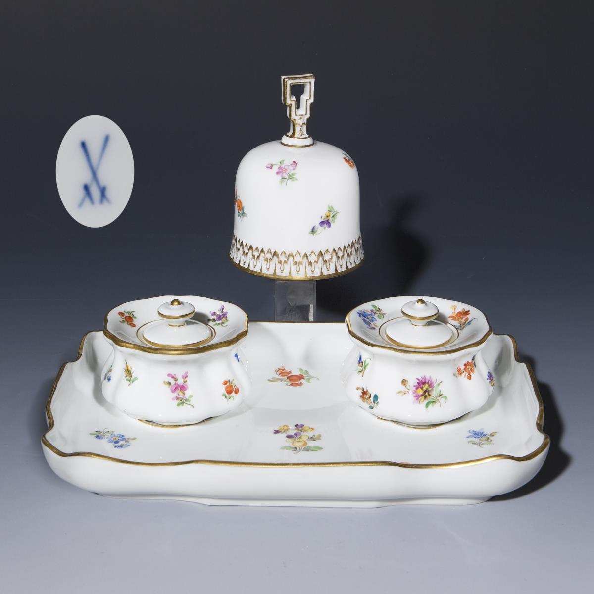 Farbig bemalt, "Streublumendekor", gold staffiert. 4 Teile: Tablett, Paar Tintenfässer, Tischglocke. Glocke mit Holz-Klöppel an Messingsteg mit eingehangener Öse. Pressmarke, Schwertermarken.