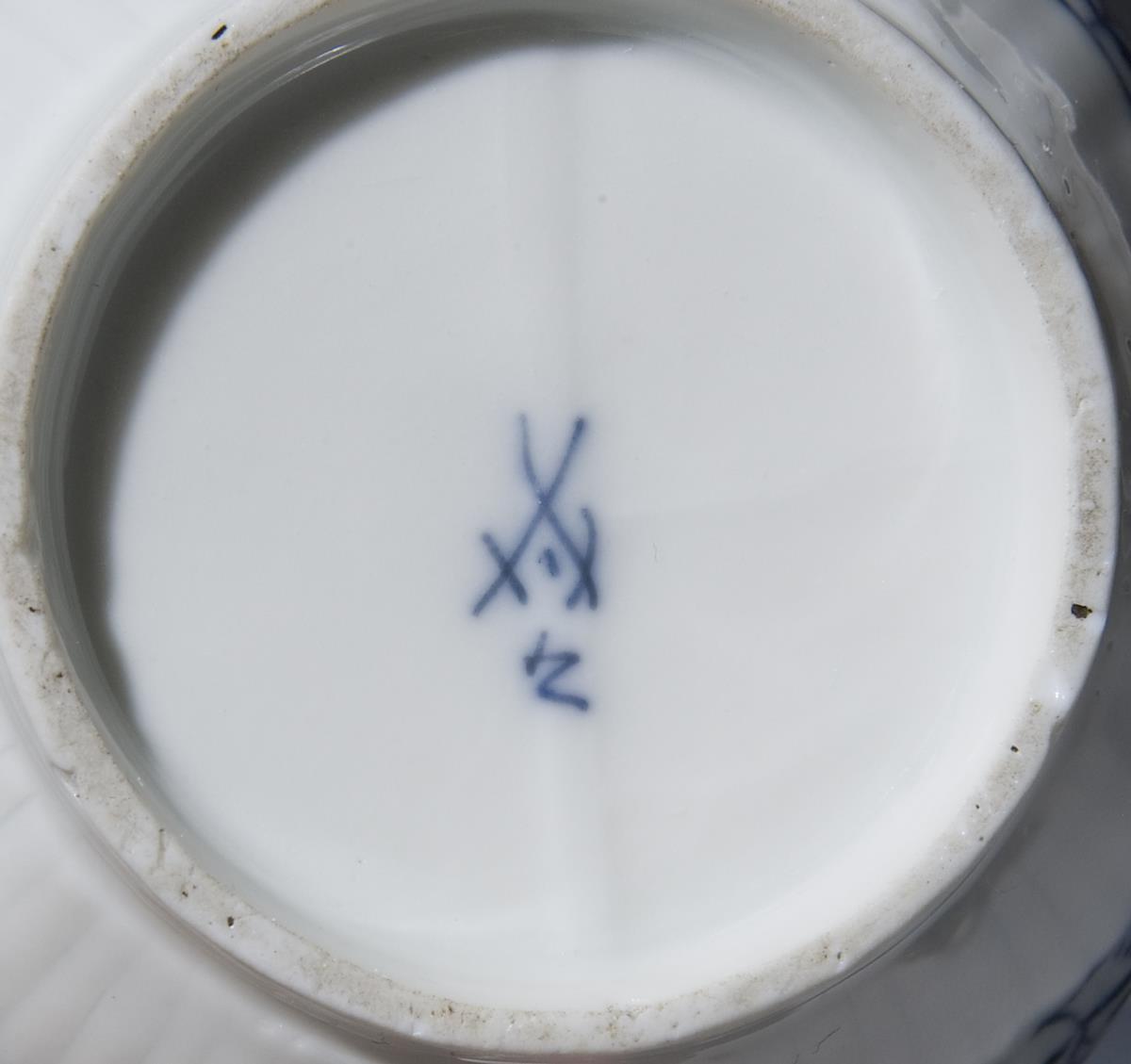 Reliefdekor "Gebrochener Stab". Kobaltblaue Unterglasurmalerei, "Strohblumendekor". 20 Teile: Teekanne, Kaffeekanne, 9 Koppchen, 9 Untertassen. Schwertermarken, neun Schwertermarken mit Punkt, eine Schwertermarke mit Stern. Zwei Ränder, zwei Standringe minimal bestoßen, ein Deckel restauriert, eine Kanne mit zwei kleinen Brandrissen.