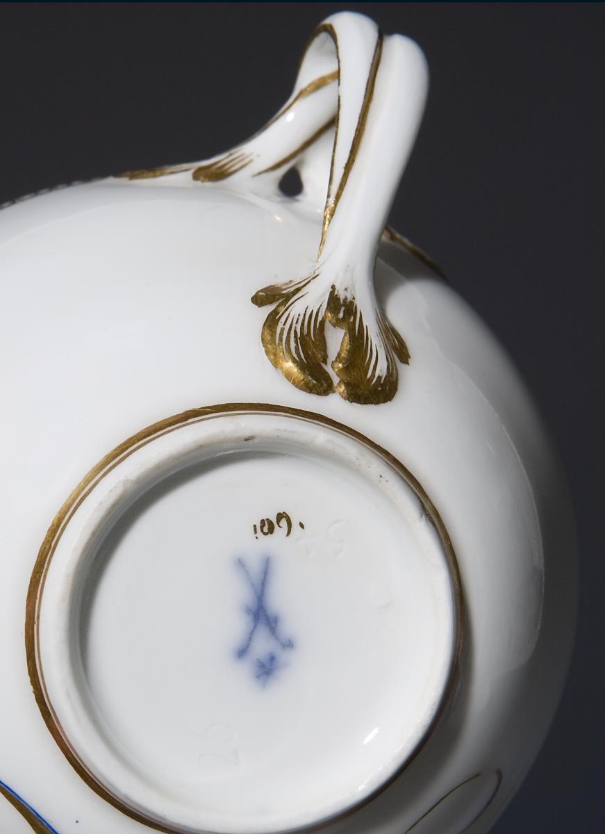 Goldene Galerie-Kanten, kobaltblau konturiertes Goldmonogramm, Goldstaffage. Pressmarken, Malermarke, Schwertermarken mit Stern. Gold partiell berieben.