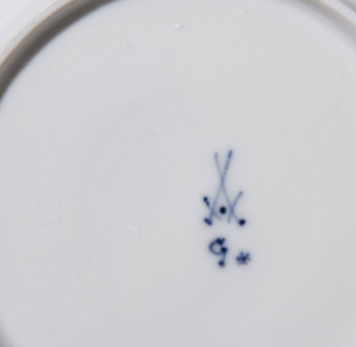 Kobaltblaue Unterglasurmalerei, Blumen- und Insektendekor. Schwertermarken, eine Schwertermarke mit Punkt und Malermarke. Ein Standring leicht bestoßen.