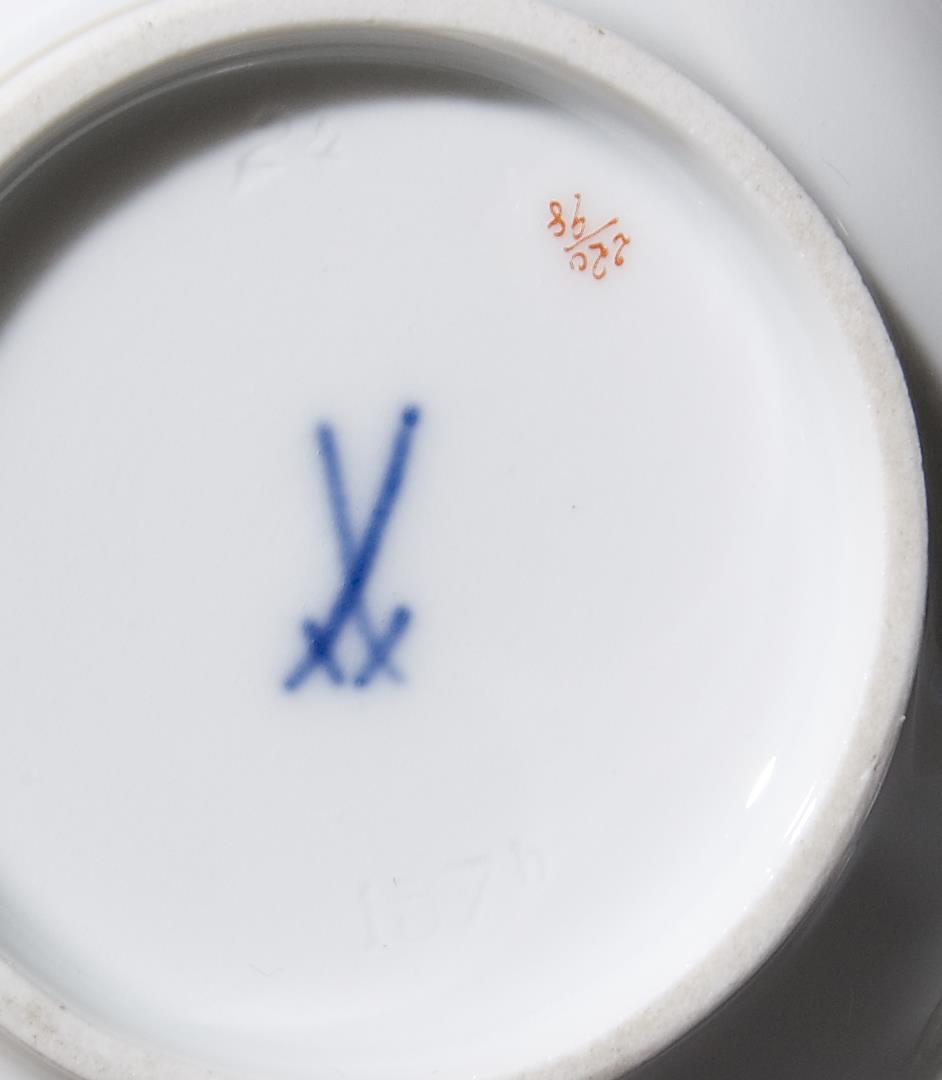 Form "Neuer Ausschnitt". 19 Teile: 1 großes Tablett, 1 Zuckerdose, 1 Milchkännchen, 1 Vase, 5 Tassen, 5 Untertassen, 5 Konfektschälchen. Farbige Blumenbemalung, gold staffiert. Pressmarken, Malermarken, Schwertermarken. Eine Schwertermarke mit Punkt. Tablett-Goldrand partiell berieben, Stand uneben, eine Lippe, Rose leicht bestoßen.