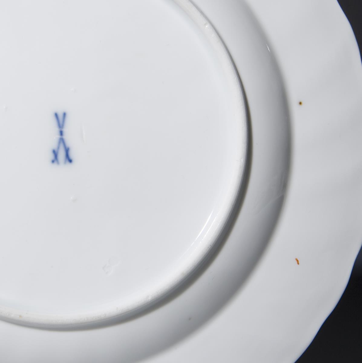 Modell von Johann Joachim Kaendler und Johann Friedrich Eberlein 1737-1741. Die gesamte Oberfläche reliefiert. Spiegel naturalistisch bemalt. Gold staffierter Rand. Pressmarke, Schwertermarke dreimal gestrichen.