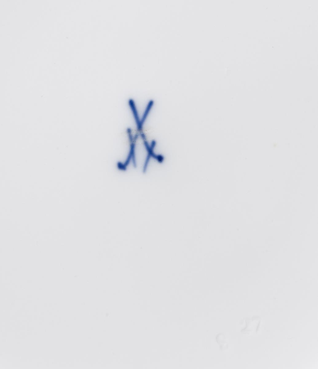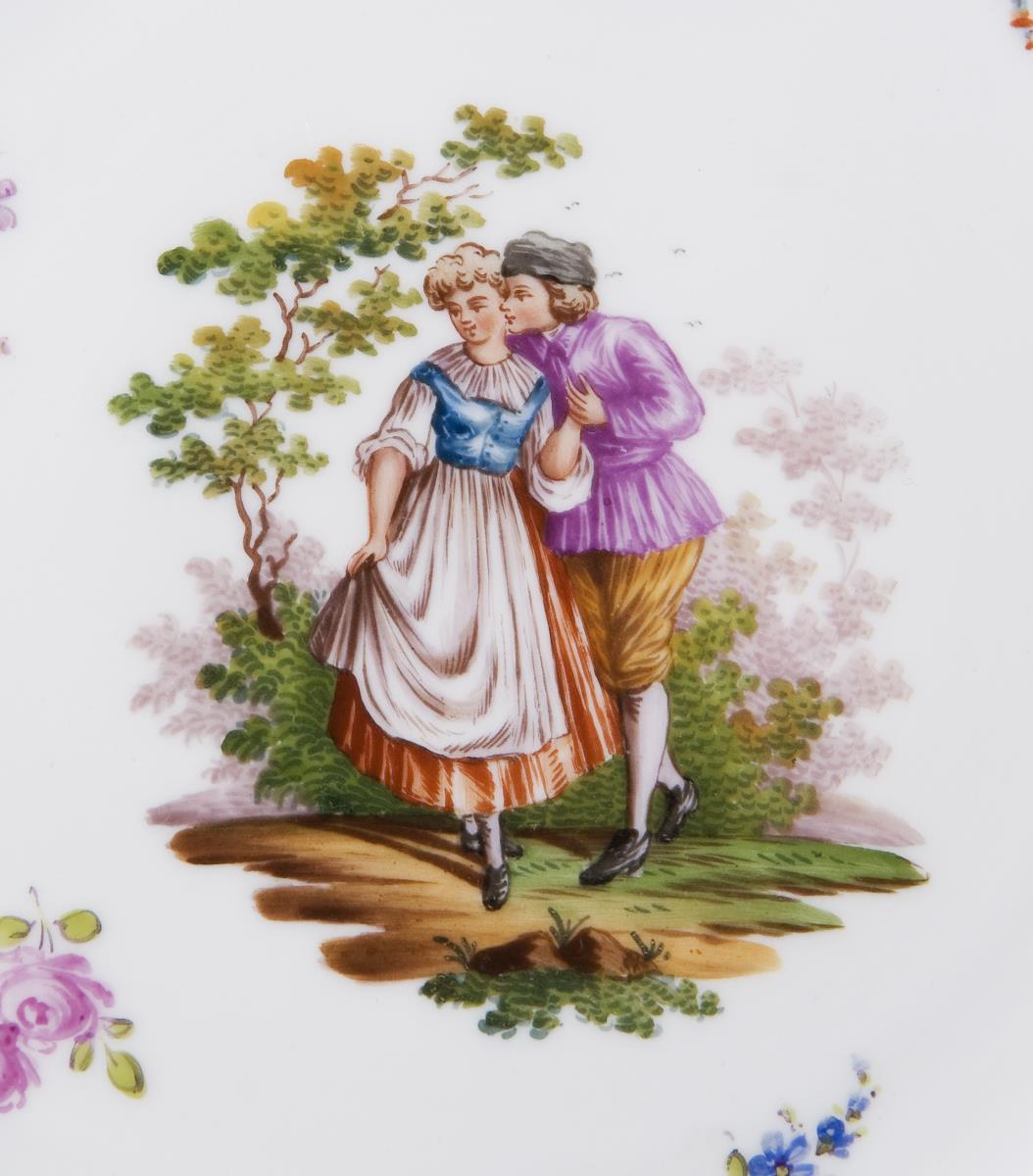Farbig bemalt, gold staffiert, goldene Bordüre mit Blüten-Festons. Zwischen gestreuten Blüten Parkszene mit jungem Paar. Pressmarken, Schwertermarke zweimal gestrichen. Goldrand berieben.