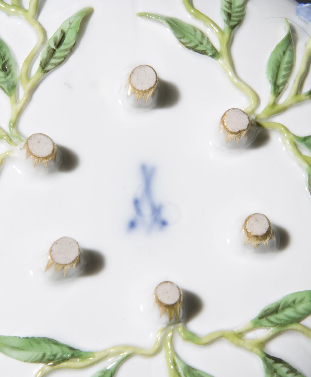 Allseits plastisch aufgelegte, naturalistisch bemalte Vergißmeinnicht-Blütenzweige. Farbig bemalt, gold staffiert, Streublumen- und Insektendekor. Schwertermarken. Blüten bestoßen.