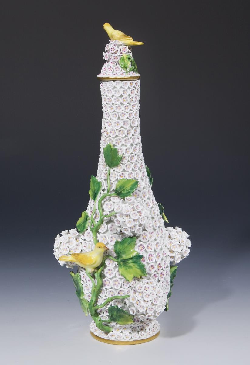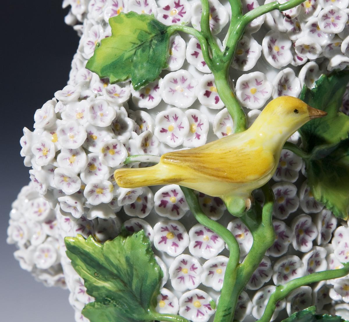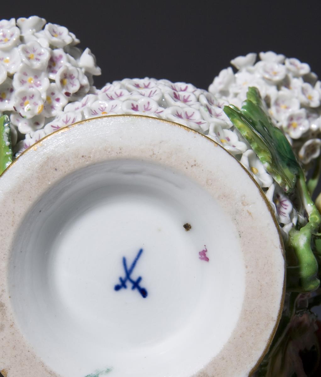 Modell von Johann Joachim Kaendler 1739. Die gesamte Oberfläche belegt mit Purpur und Gelb staffierten Schneeballblüten, darauf plastisch aufgelegte Zweige und kugelige Schneeballen, auf denen die Vögel sitzen. Zweige und Vögel naturalistisch bemalt. Gold staffierte Ränder. Malermarke, Schwertermarke. Sechs Blätter, zwei Schwanzfedern restauriert, äußerst wenige Schneeballblüten, vier Blattspitzen leicht bestoßen.