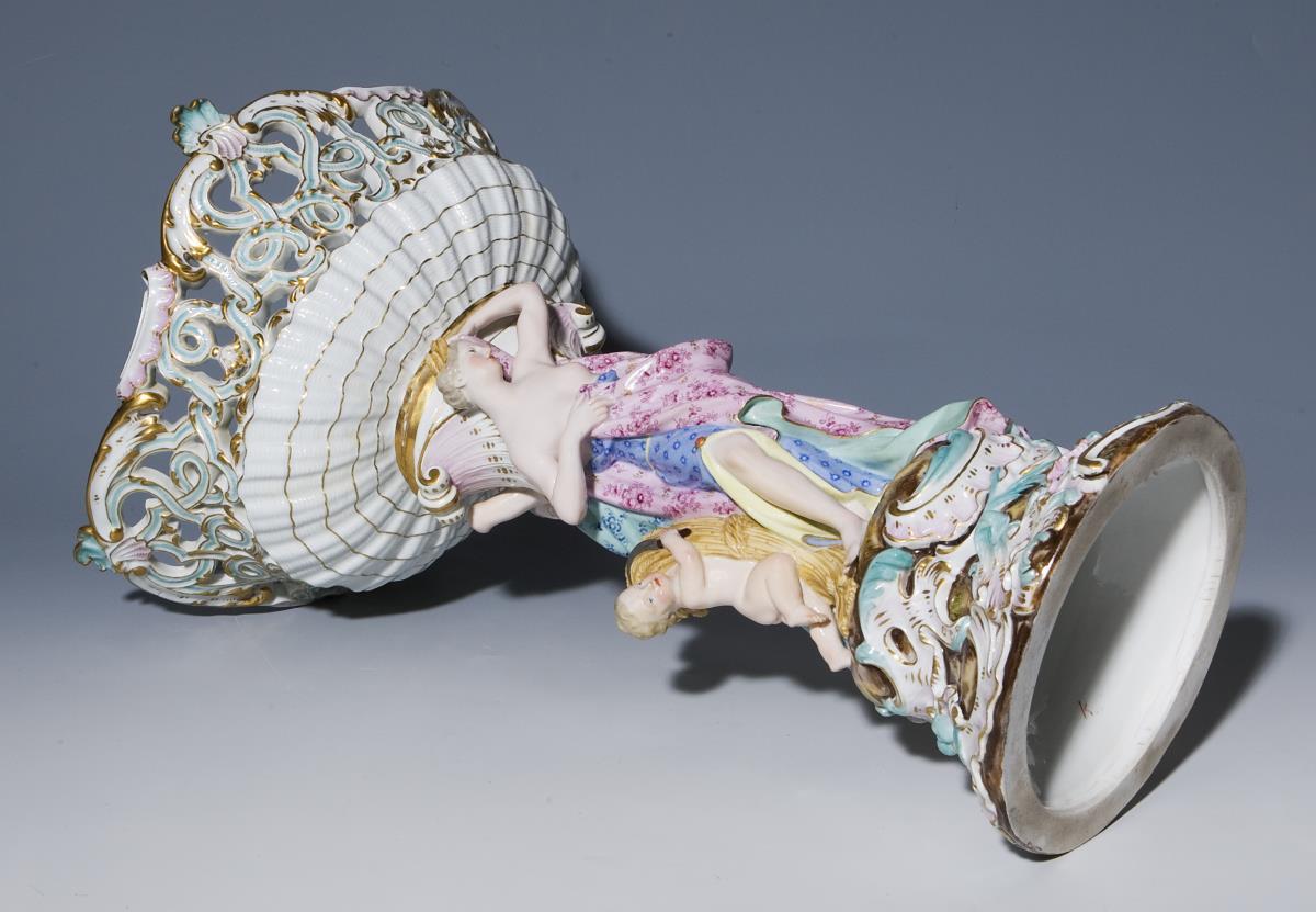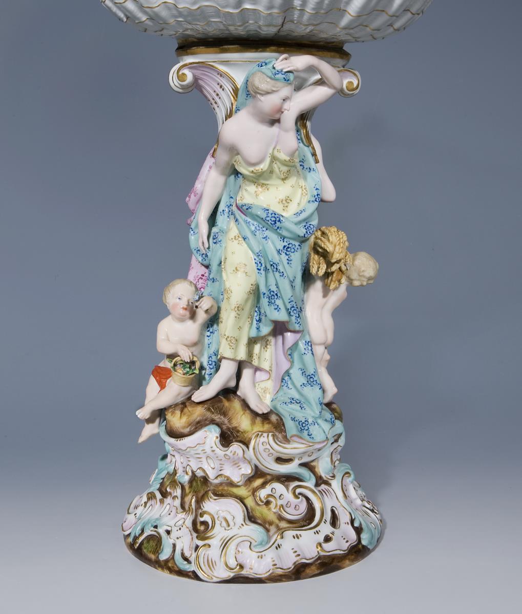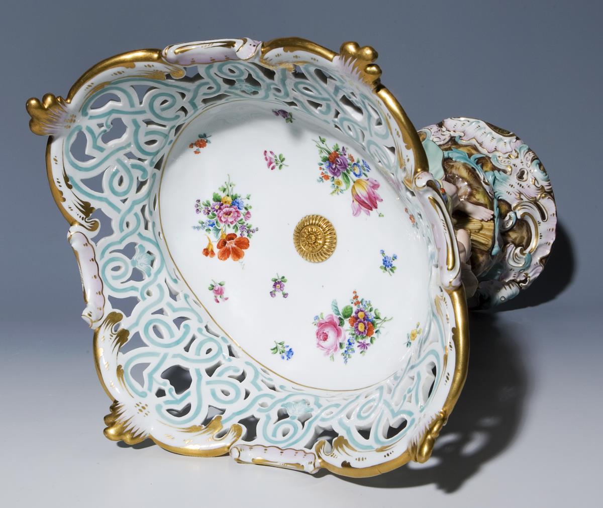 Modell von Johann Joachim Kaendler und Johann Friedrich Eberlein 1744. Farbig bemalt, reliefiert, gold staffiert. Innenkorb mit farbiger Blumenbemalung. Ritzmarke, Malermarke, Schwertermarke einmal gestrichen. Drei Amoretten-Zehen, eine Ährenspitze, zwei Blättchen bestoßen, ein Haarriss über vier Zehen, Korb-Außenwandung mit Brandrissen.