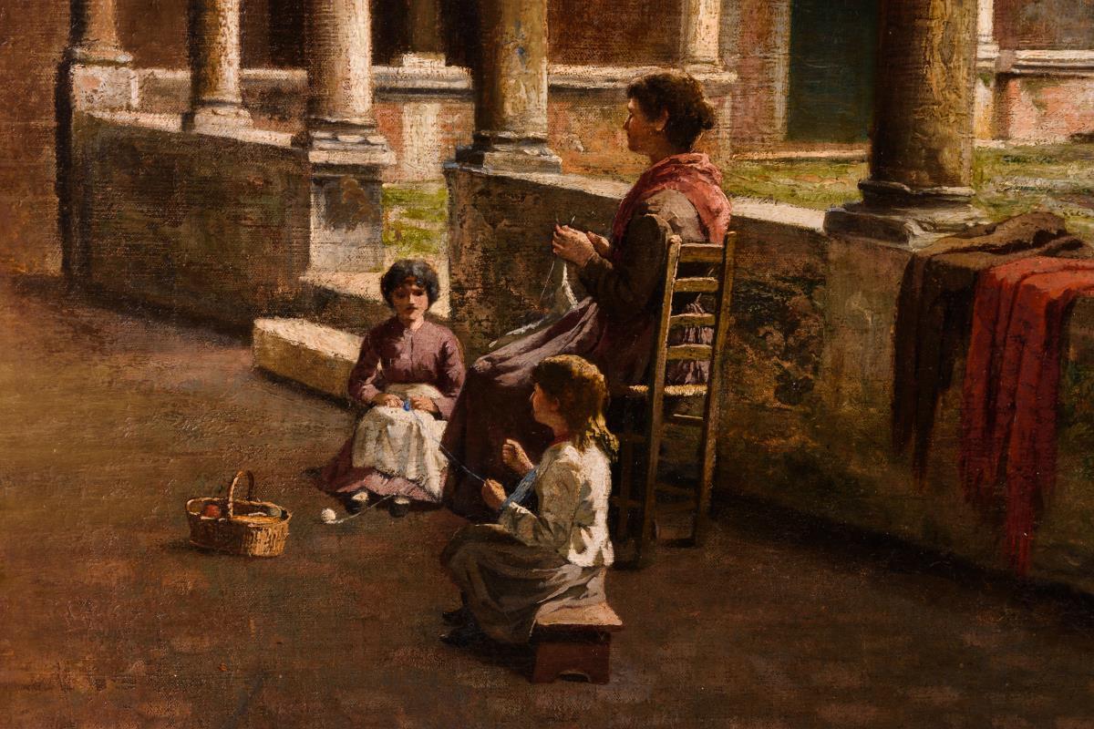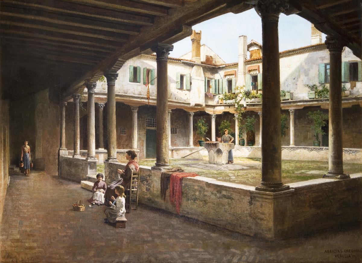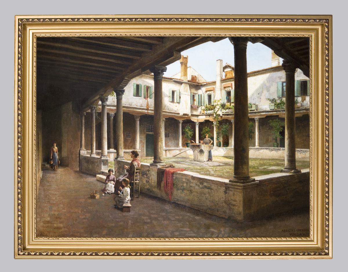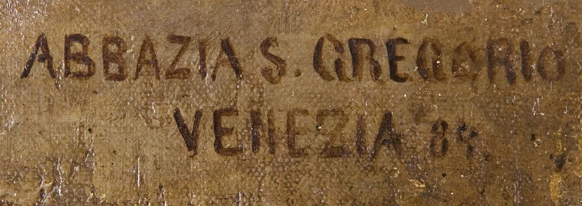 Die Abbazia San Gregorio mit dem beeindruckendem Innenhof liegt zentral am Canal Grande. Sie wurde im 9. Jahrhundert als Benediktiner-Abtei erbaut. Im frühen 20. Jahrhundert restauriert. Anlässlich der Biennale di Venezia 2019 beinhaltete sie Ausstellungen mit Objekten der ältesteten kommerziellen Kunstgalerie der Welt Colnaghi (1760 gegründet) und Minassian Chahan (Innenarchitekt, Designer, Galerist). Bezeichnet. Neuwertiger profilierter Goldrahmen. Doubliert.