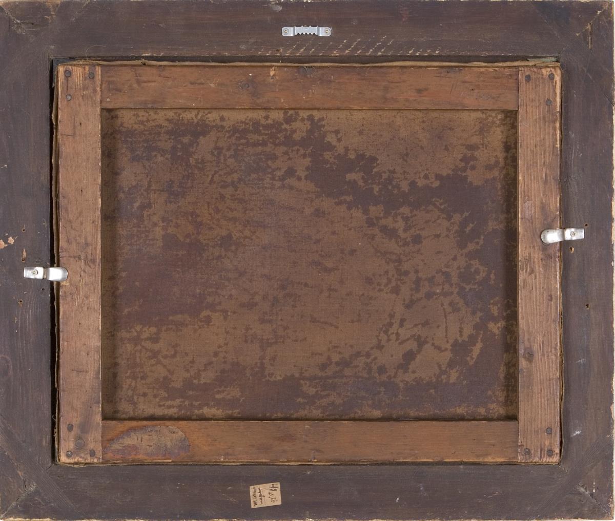 Originaler Spannrahmen, bronzierter Stuckrahmen. Fleckiger, kein fachgerechter Firnis-Auftrag, Rahmen leicht defekt.