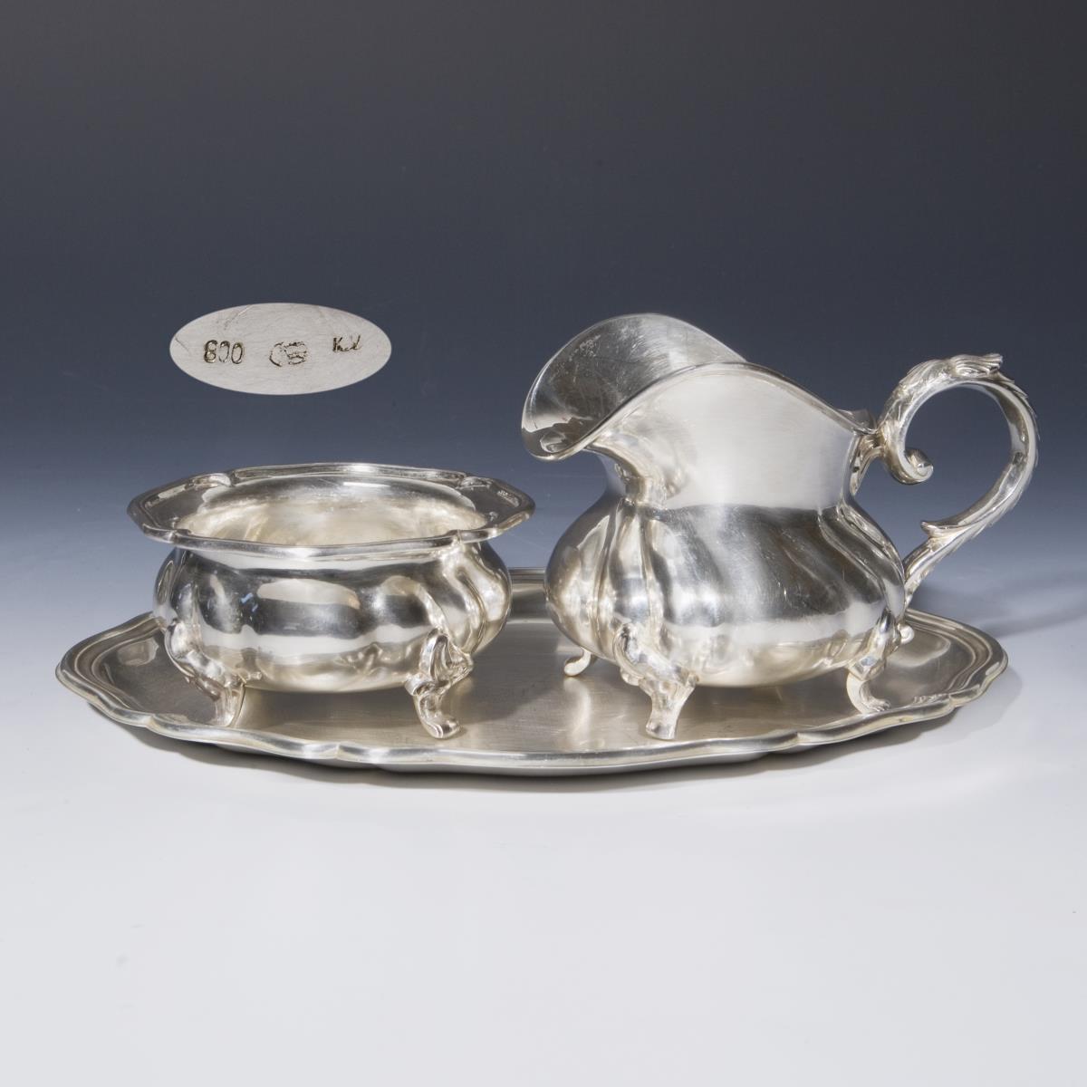 3 Teile: Milchkännchen, Zuckerschale, Tablett. Silber, godroniert und reliefiert. Gefäße in deutscher Handarbeit. Punzen mit Halbmond und Krone, Feingehalt und Firmenstempel, ein Schriftzug: Handarbeit. Kännchen mit kleinen Dellen.