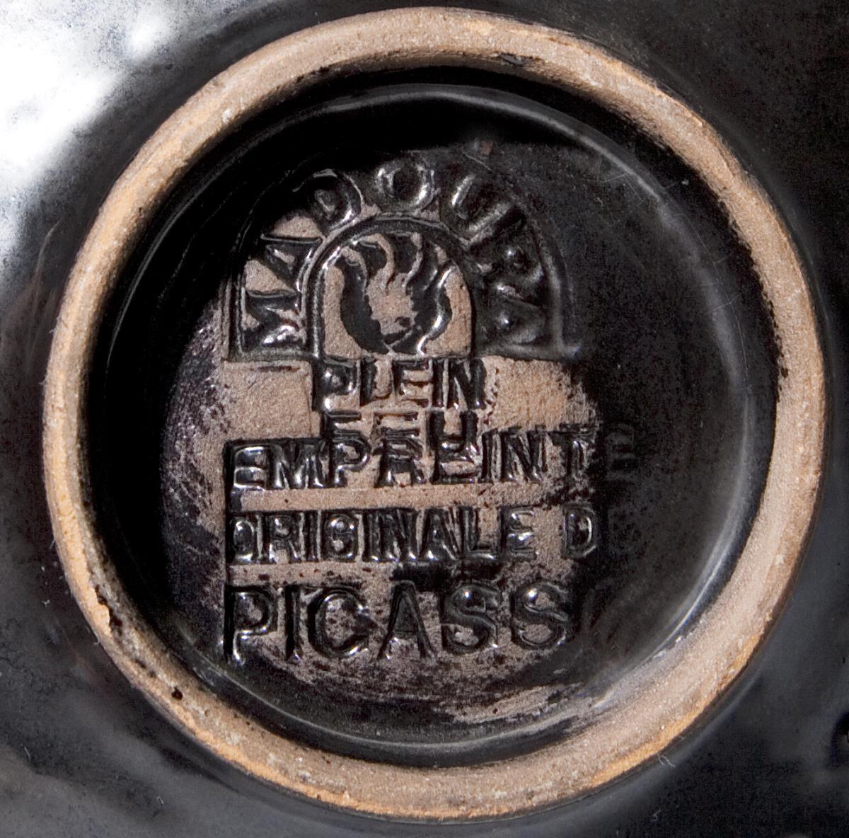 Keramik 1955 aus einer Auflage von 100 Exemplaren. Rotbrauner Scherben mit Reliefdekor, rückseitig schwarz glasiert. Pressmarke: Empreinte Originale de Picasso, Madoura plein feu.