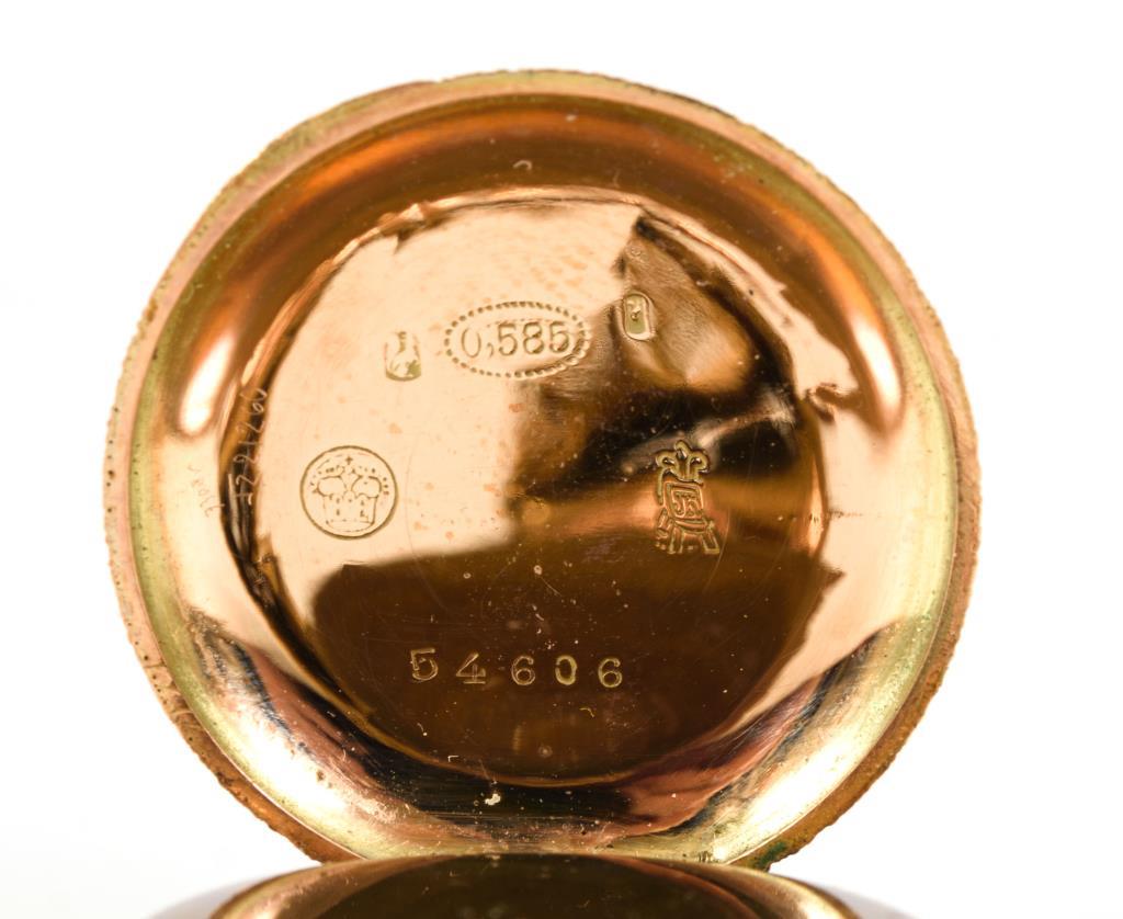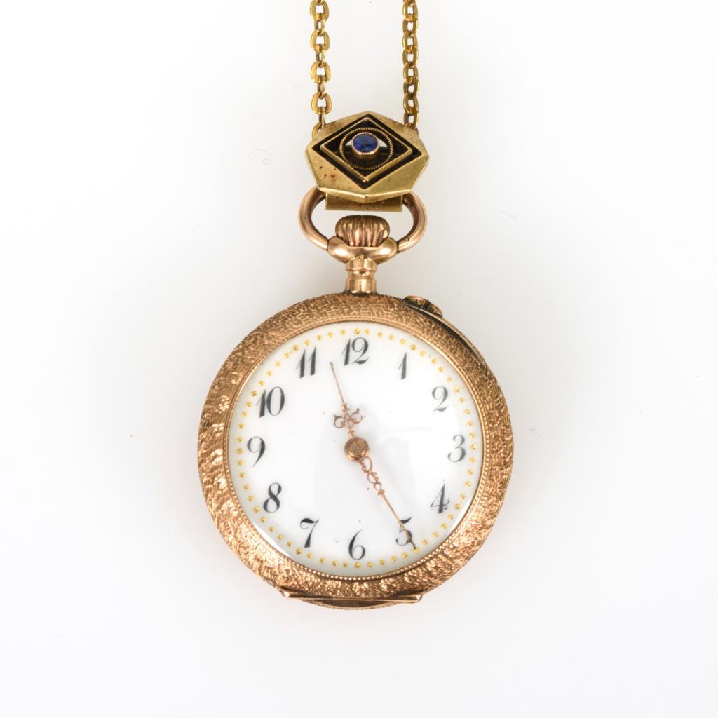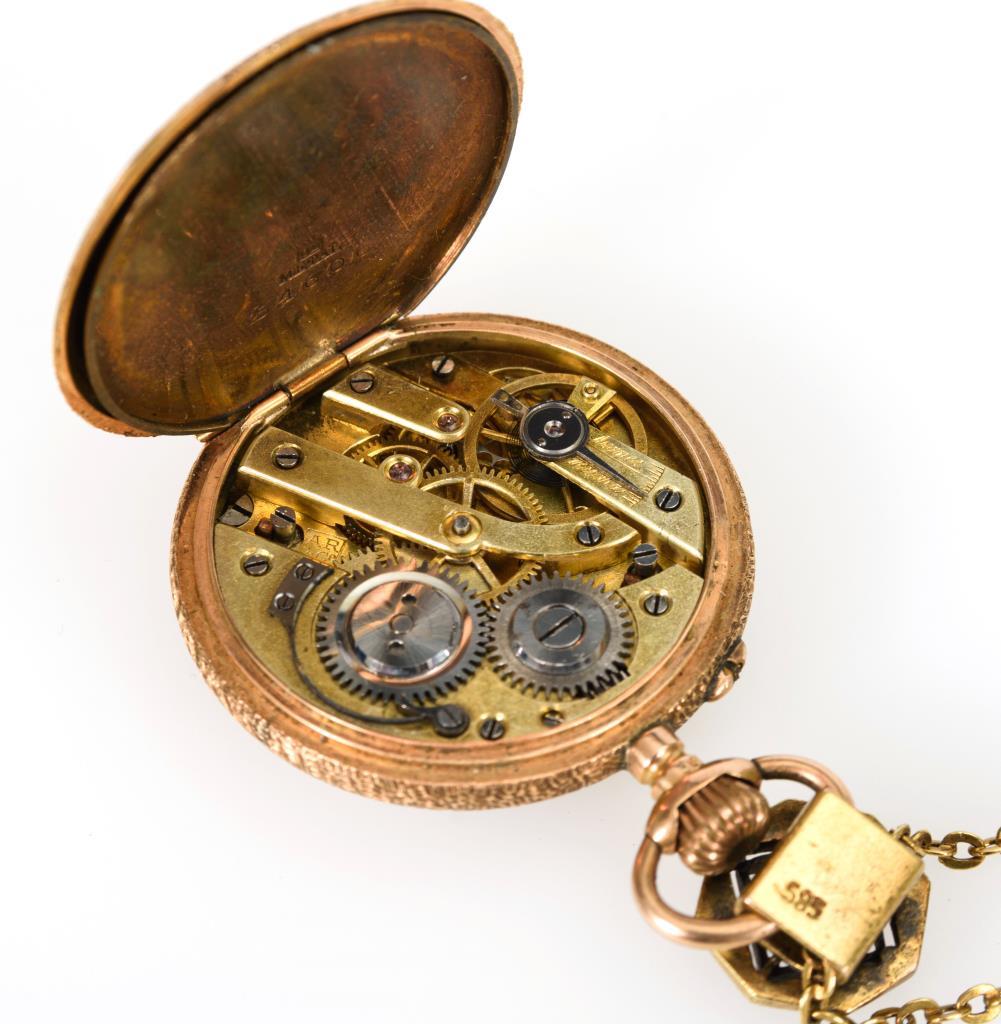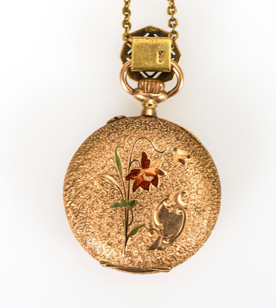 585 RG, Schweizer Beschauzeichen, Feingehaltsstempel, Firmenmarke gepunzt. Ziseliertes Gehäuse mit farbig emaillierter Blume und leerer Wappenkartusche. Staubdeckel aus Metall. An ergänzter 585 GG gepunzter Gliederkette mit Schieber. Werk läuft kurz an.Defekte an Email.