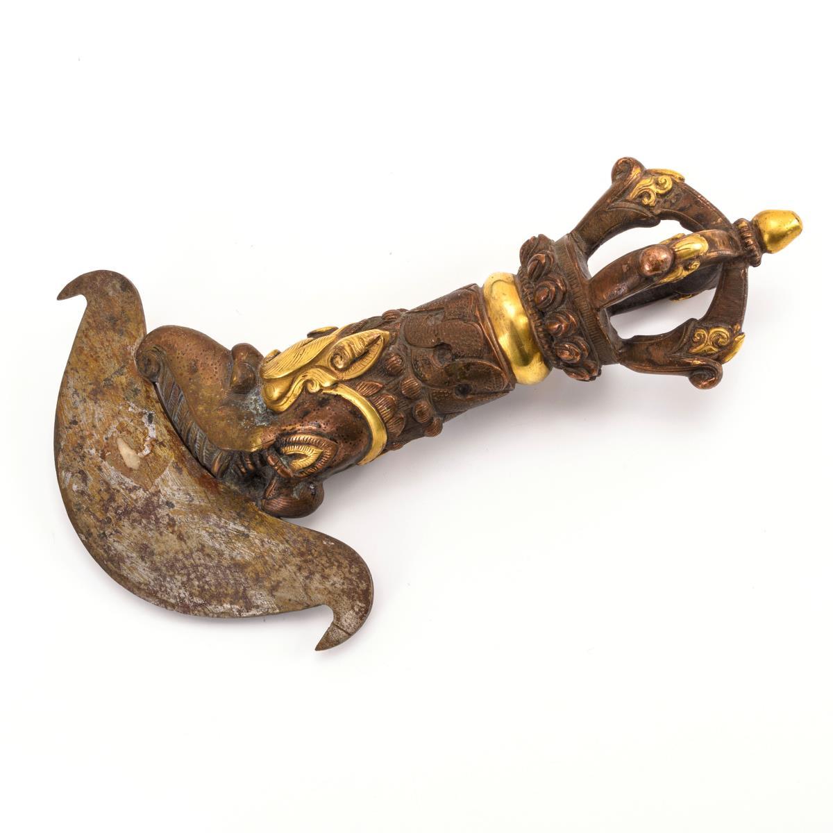 Scharfe, halbrunde Klinge. Massiver Griff mit Vajra-Knauf.