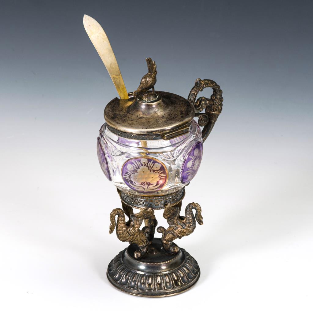 Kugeliger Glaskorpus mit Scharnierdeckel, auf 3 Schwanenkörpern ruhend. Dazu teilvergoldetes Löffelchen. Altersspuren.