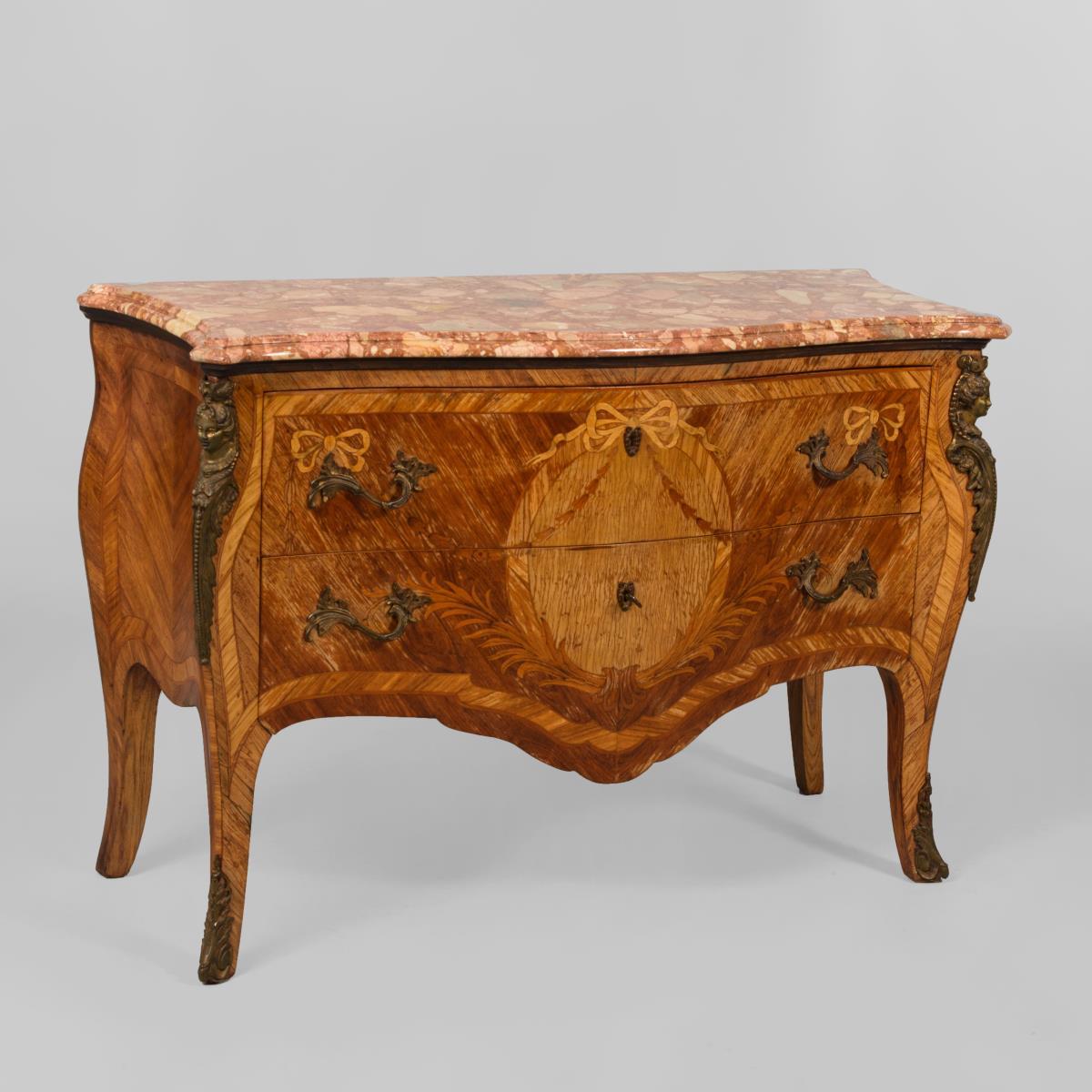 2-schübige Kommode im Stil des französischen Rokoko, mit geschwungenem Korpus und roter Marmorplatte. Verziert mit üppigen Bronzebeschlägen aus Karyatiden- und Rocaillendekor sowie Schleifenmarketerie. Furnier restaurierungsbedürftig.