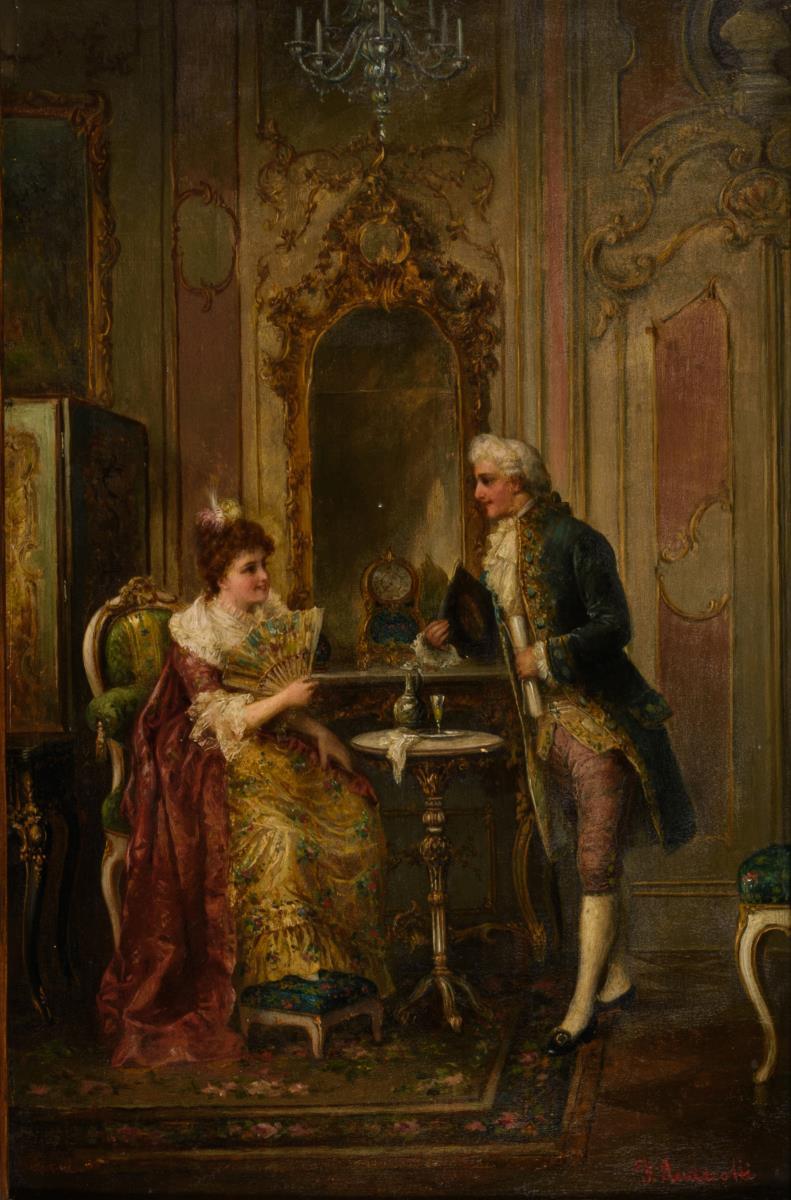 Junger Adliger in der Mode des 18. Jahrhunderts im Gespräch mit einer Dame in herrschaftlichen Räumlichkeiten. Minimale Altersspuren.