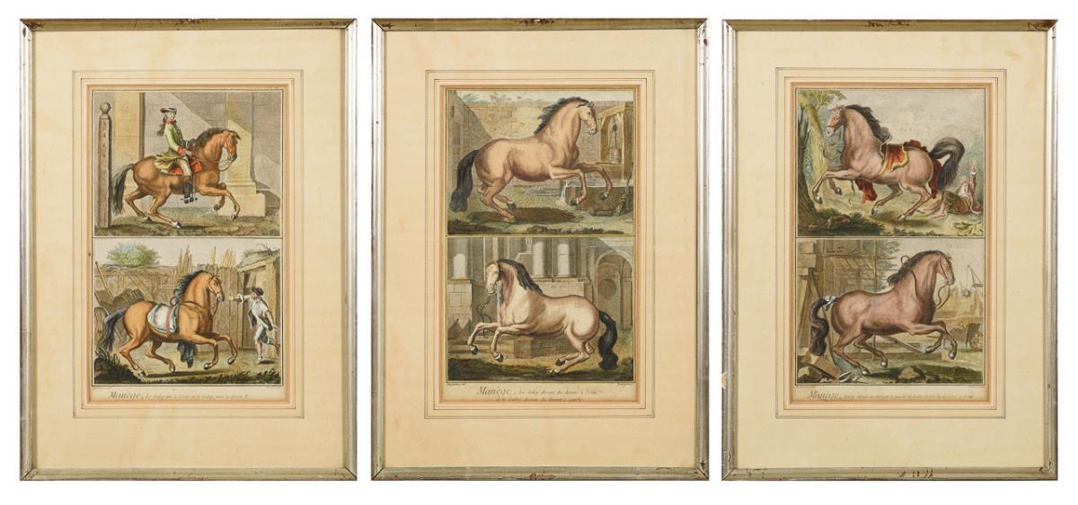 3 Ansichten aus Diderots und d'Alemberts "Encyclopédie ou Dictionnaire raisonné des sciences, des arts et des métiers [...]" (Enzyklopädie oder ein durchdachtes Wörterbuch der Wissenschaften, Künste und Handwerke) zur Reitschule: "Manège, Galop desuni du derriere à gauche et Galop desuni du derriere à droite", "Manège, Le Galop à droite et le Galop faux à droite" und "Manège, Le Galop desuni du devant à droite; et le Galop desuni du devant à gauche", gezeichnet von Harguinez, gestochen von Robert Benard. Etwas stockfleckig.