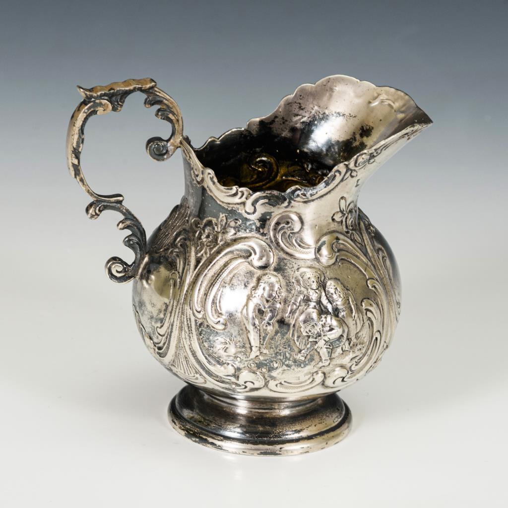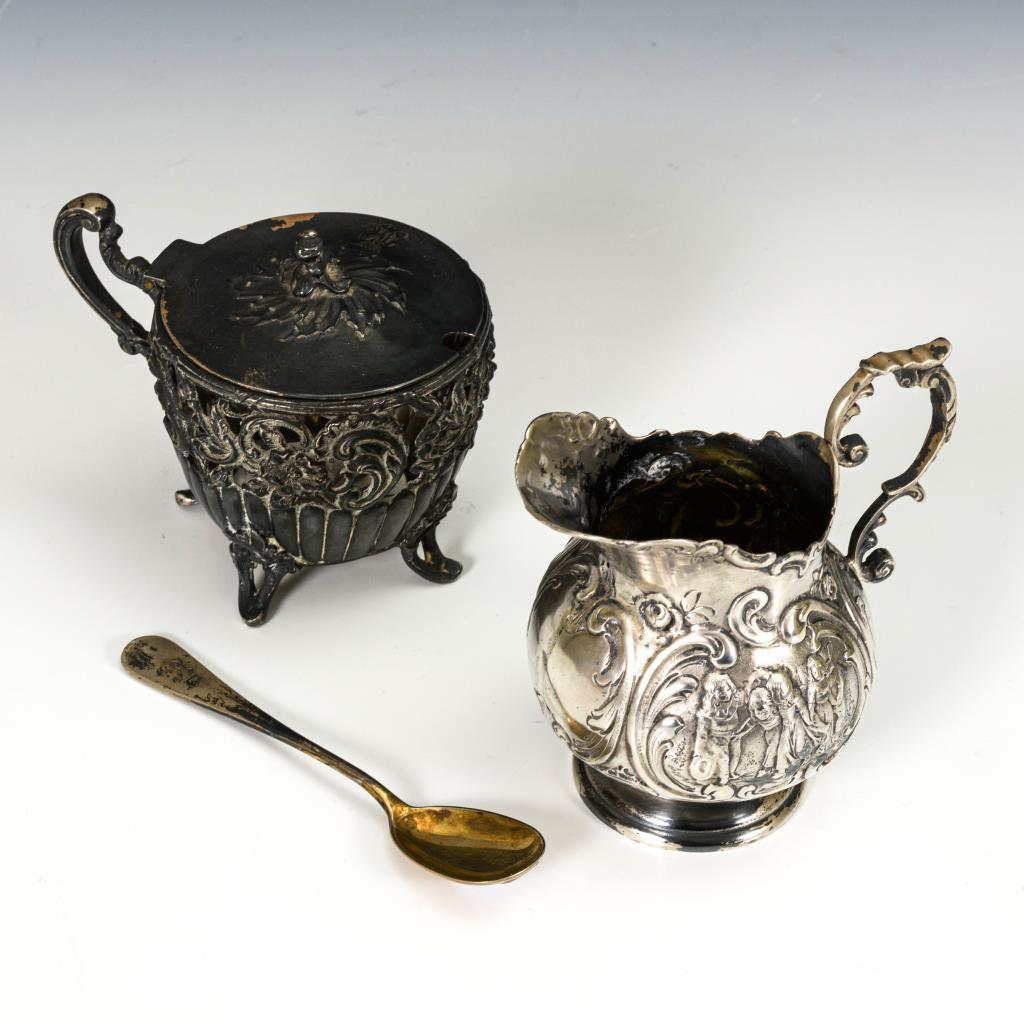 Kännchen und Dose reich reliefiert, Löffel mit bekrönter Monogrammgravur "CK". Altersspuren.