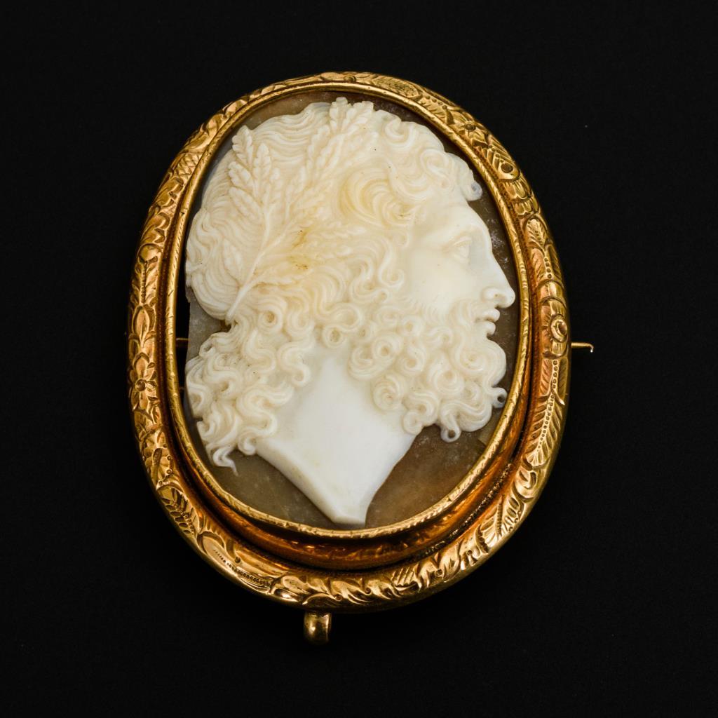 Antikisierend geschnittener Männerprofilkopf (Jupiter?) in Zargenfassung mit reliefiertem Rand. Hakenverschluss, Abhängeöse. Seitlich schmale Kameefehlstelle.