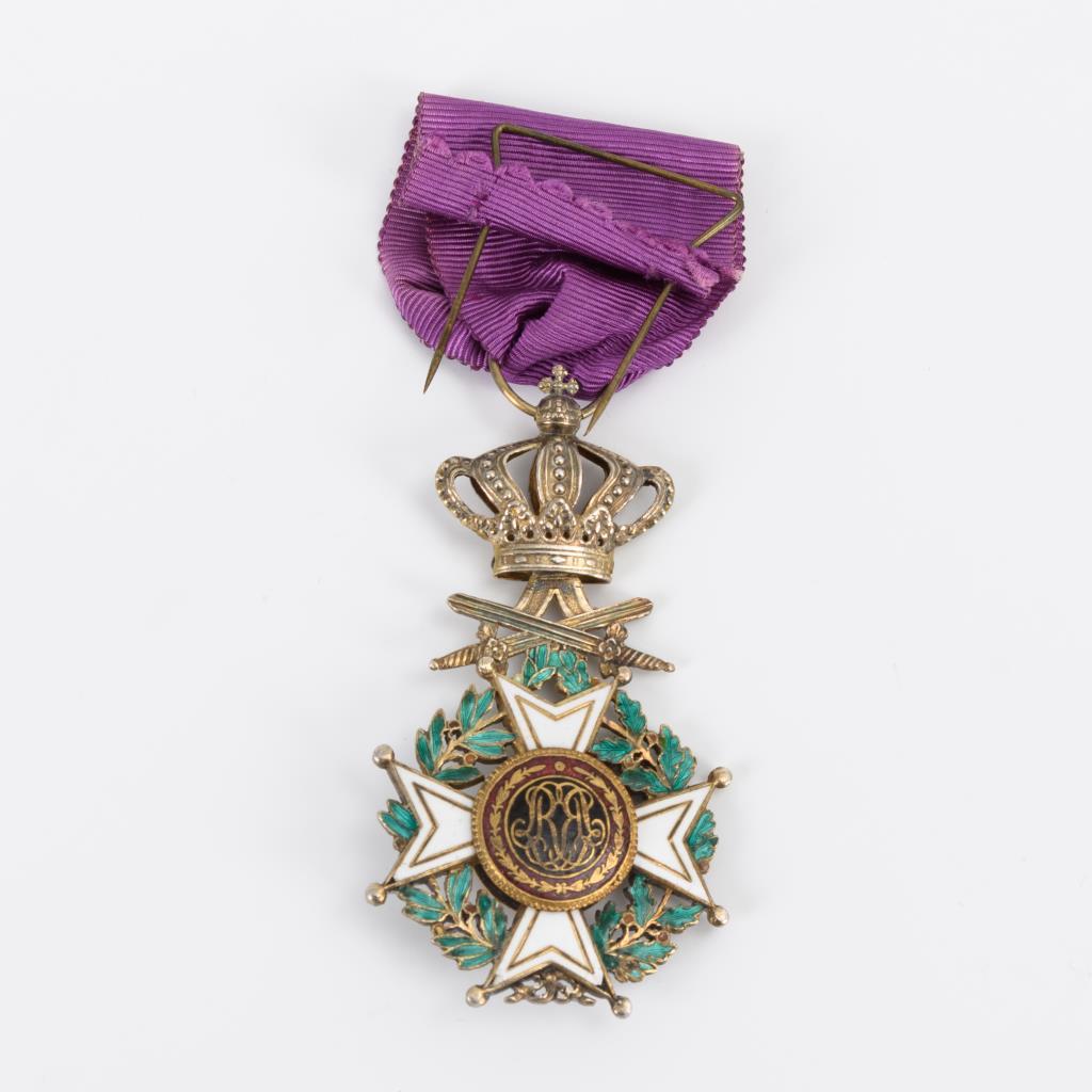 Johanniterkreuz mit belgischem Löwen und Umschrift "L’UNION FAIT LA FORCE", verso Monogramm LR. Königskrone mit gekreuzten Schwertern. Schatulle "Arthus Bertrand Paris" gemarkt. Geringe Emailabplatzer, defekte Schatulle.