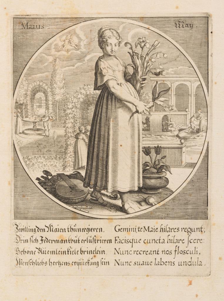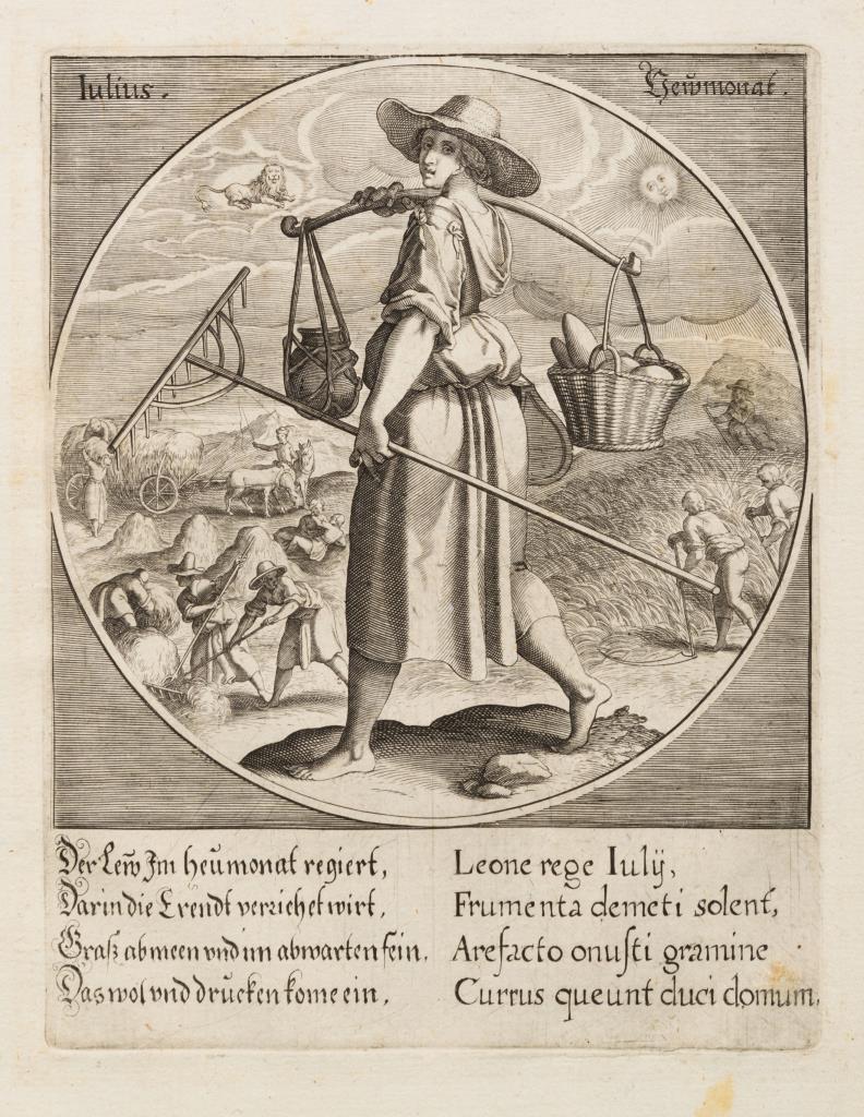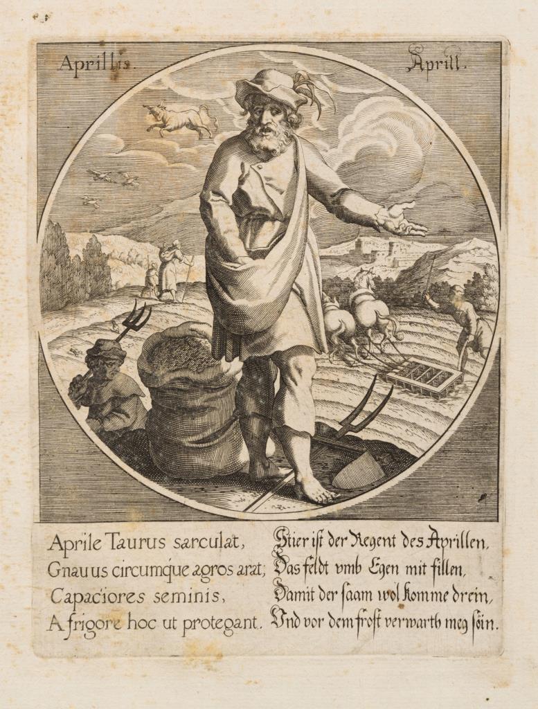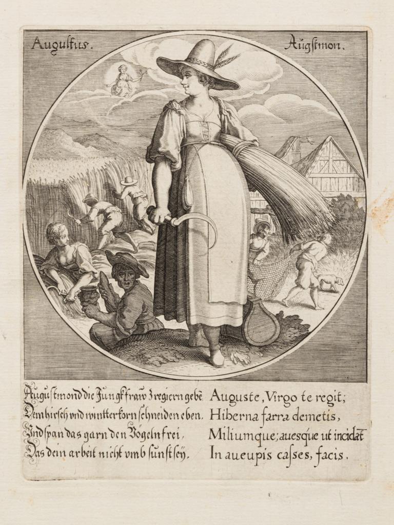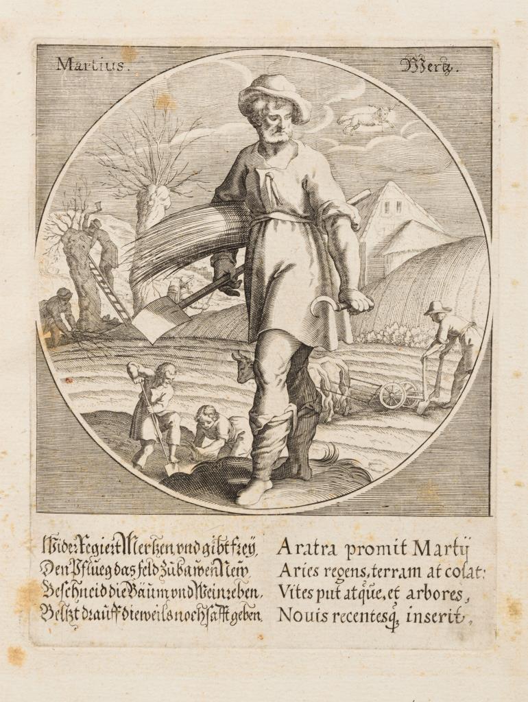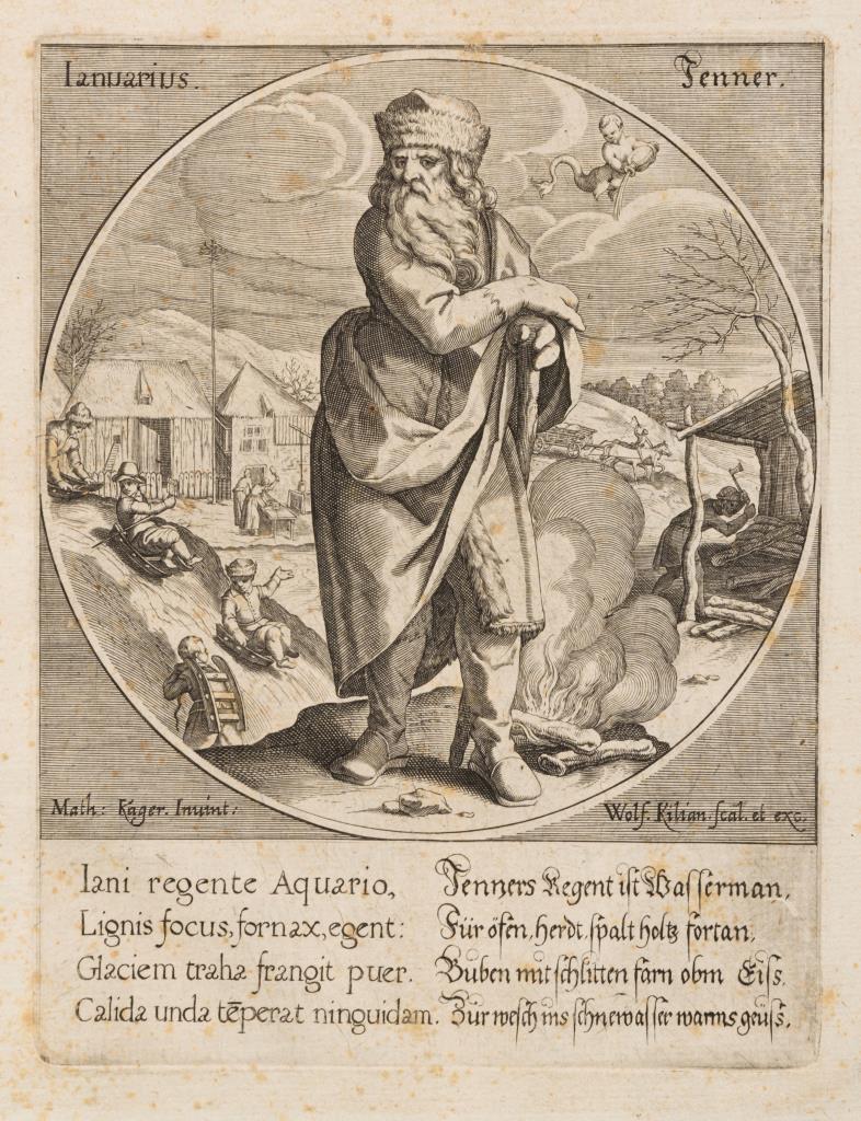 12 personifizierte Darstellungen der 12 Monate, nach Zeichnungen von Matthias Kager, aus: "Dvodecim Anni Menses - Die Zwölff Monadt des Jarres [...]", 1617. Stockflecke.