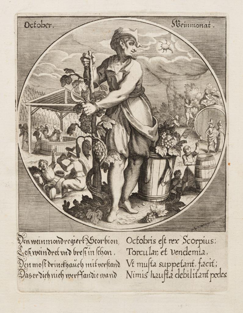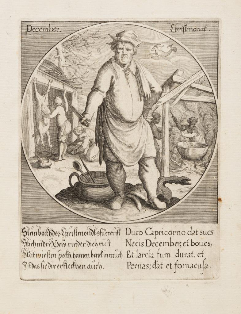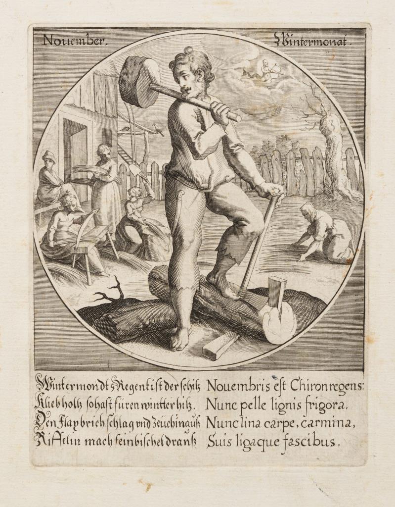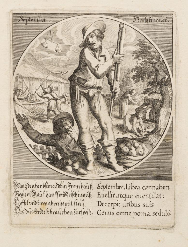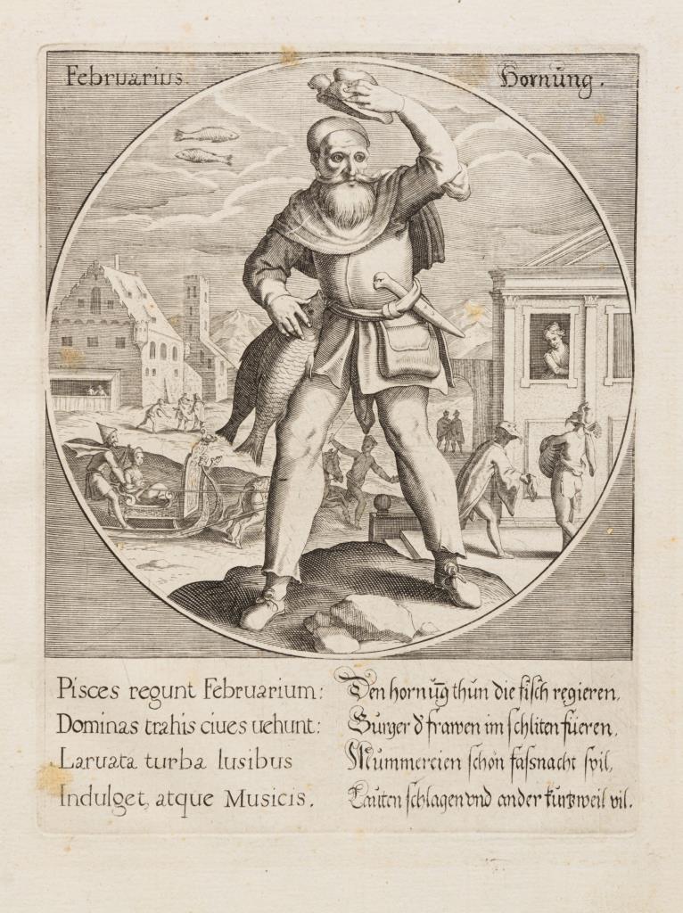 12 personifizierte Darstellungen der 12 Monate, nach Zeichnungen von Matthias Kager, aus: "Dvodecim Anni Menses - Die Zwölff Monadt des Jarres [...]", 1617. Stockflecke.