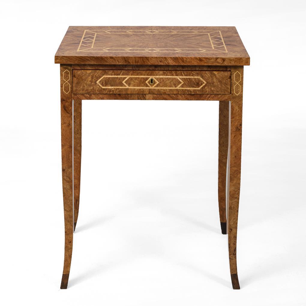 Rechteckiges Beistelltischen mit Zargenschub, auf 4 leicht ausgestellten Pfeilerbeinen, dezent dekoriert mit geometrischen Bandmarketerien. Äußerst aufwendiger zeitgenössischer Nachbau im Biedermeier-Stil. | Nachtrag 18.2.2021: minimale Gebrauchsspuren