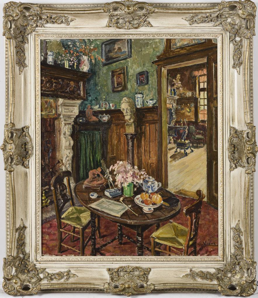 Bürgerliches Interieur mit gedecktem Tisch vor dem Kamin und verschiedenen Kunstgegenständen.