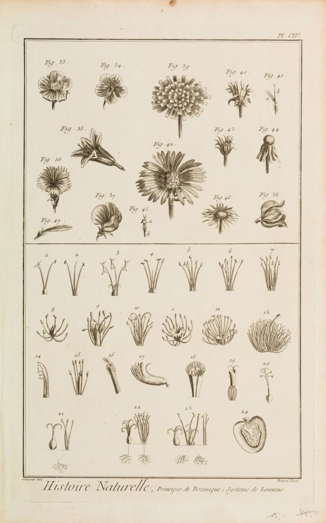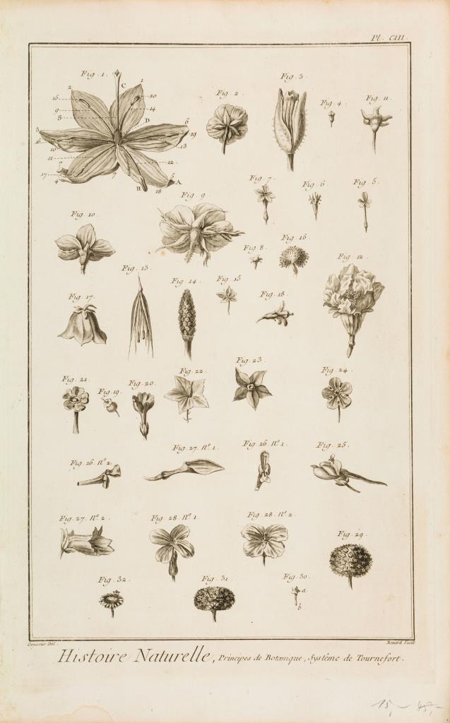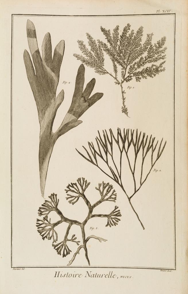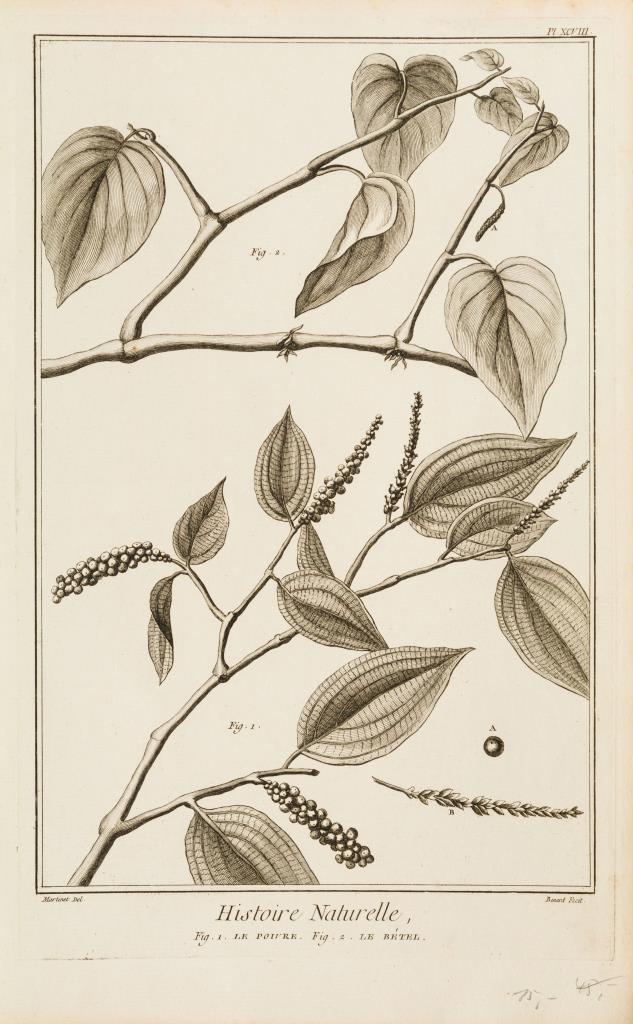 4 Pflanzendarstellungen und 2 Textblätter aus Diderots und d´Alemberts "Encyclopédie ou Dictionnaire raisonné des sciences, des arts et des métiers [...]" (Enzyklopädie oder ein durchdachtes Wörterbuch der Wissenschaften, Künste und Handwerke), nach Zeichnungen von Francois-Nicolas Martinet. Ränder mit minimalen Beschädigungen.