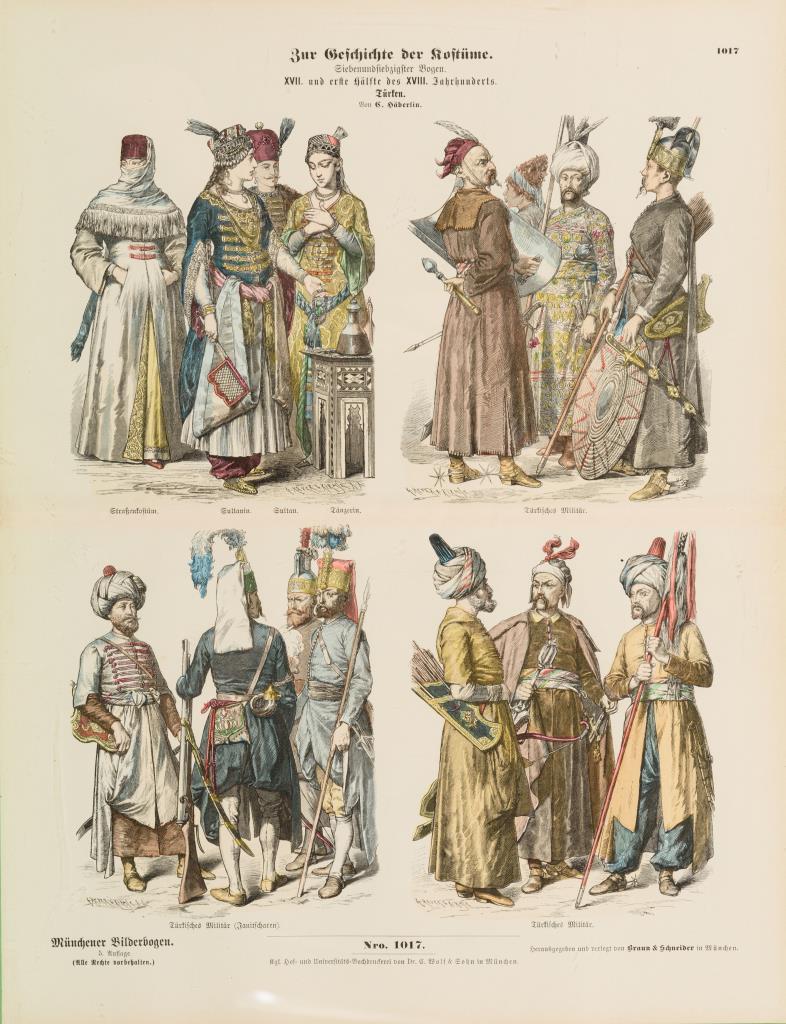 Münchener Bilderbogen: Vollständige Sammlung mit 125 losen Bögen des Werkes "Zur Geschichte der Kostüme", München 1861 - 1874, mit 500 Kostümbildern aus verschiedenen Jahrhunderten, nach Zeichnungen von Louis Braun, Ernst Fröhlich u. a.; in Pappmappe mit eingeklebtem Inhaltsverzeichnis und vorderseitig aufgeklebtem Titel. Teils minimale Beschädigungen an den Rändern.