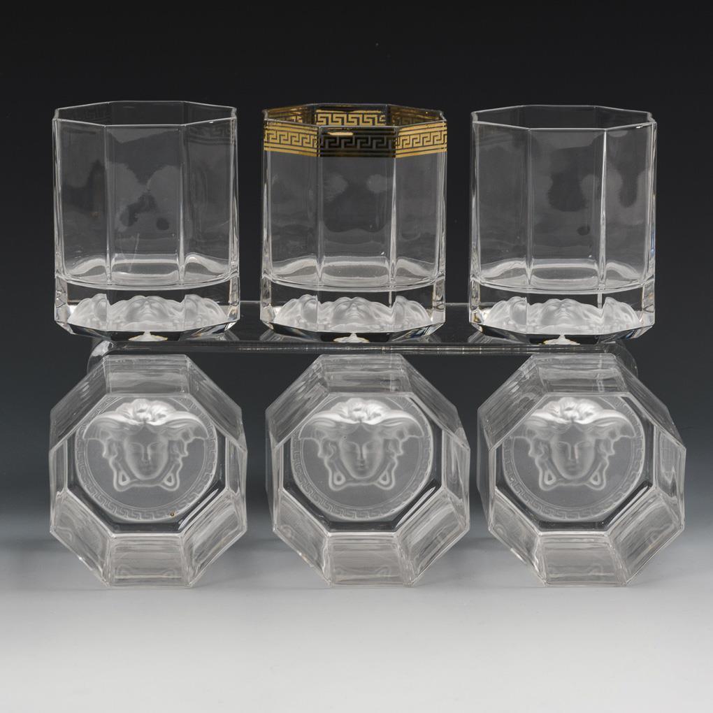 Oktogonale Gläser mit einem am Boden eingepressten, mattierten Medusenhaupt. 1 Glas mit goldener Mäanderbordüre. Gold berieben.