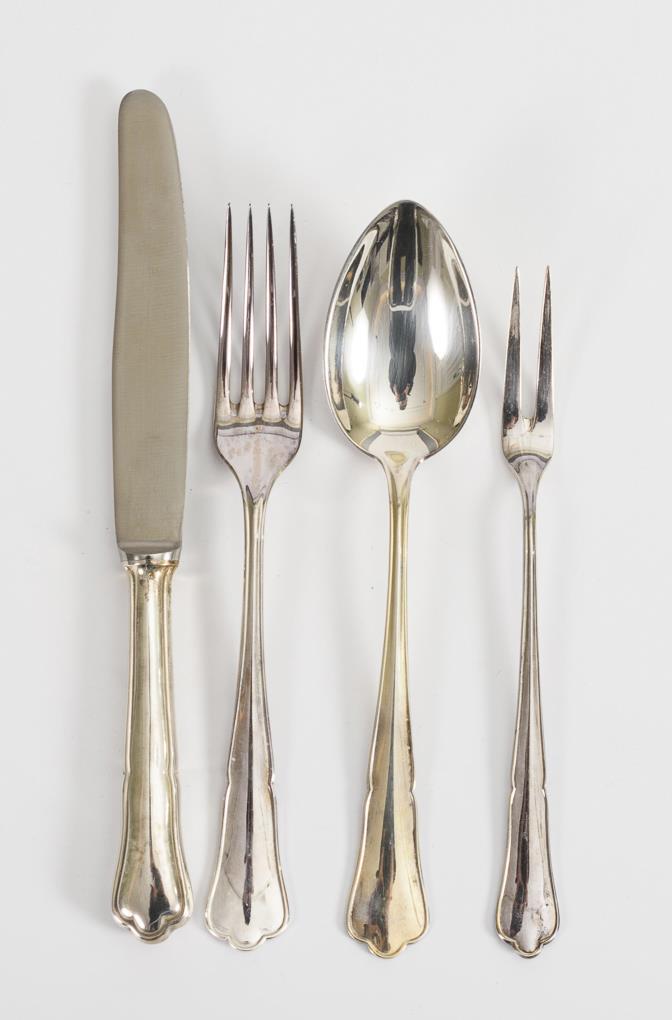 Elegantes Besteck für 12 Personen. Form "Chippendale". Bestehend aus 38 Teilen: Je 12 Speisegabeln, Speisemesser und Suppenlöffel sowie 2 passend ergänzte Fleischgabeln. Minimale Altersspuren.