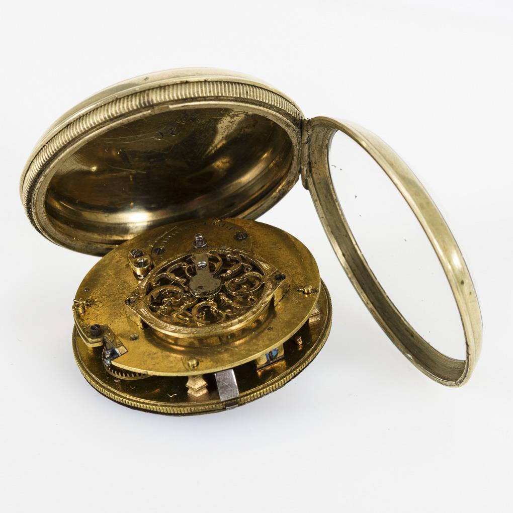 Vollplatinenwerk mit floral durchbrochener Unruhbrücke, Spindelgang, Kette und Schnecke, Schlüsselaufzug. Läuft. Blaues Emailzifferblatt mit ungewöhnlichem 5-strahligen, silbernen Ordenskreuz mit Krone, kleinem weißen Emailzifferblatt mit arabischen Zahlen, Minutenkranz und teils ergänzten Zeigern.
