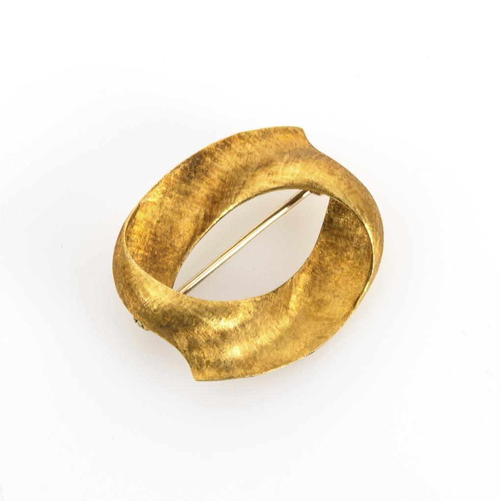 Plastische Ringbrosche mit feiner Netzgravur. Kugelhaken.