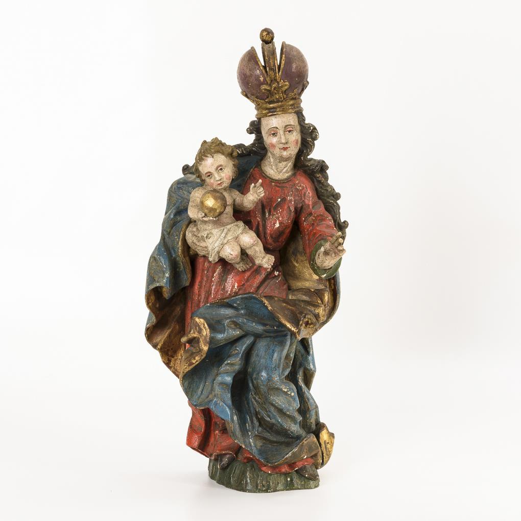 Außerordentlich stark bewegte Figur der gekrönten Maria mit dem Jesuskind auf dem Arm. Alters-/Gebrauchsspuren.