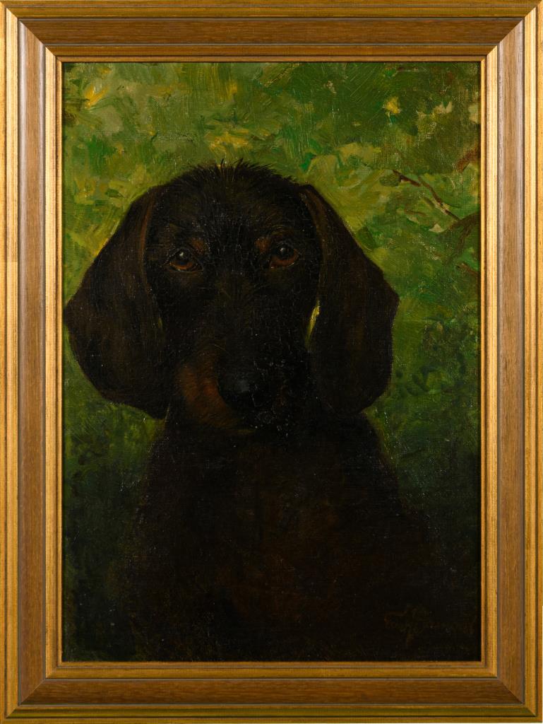 Porträt eines Hundes vor dichtem Blattwerk. Leichte Altersspuren.