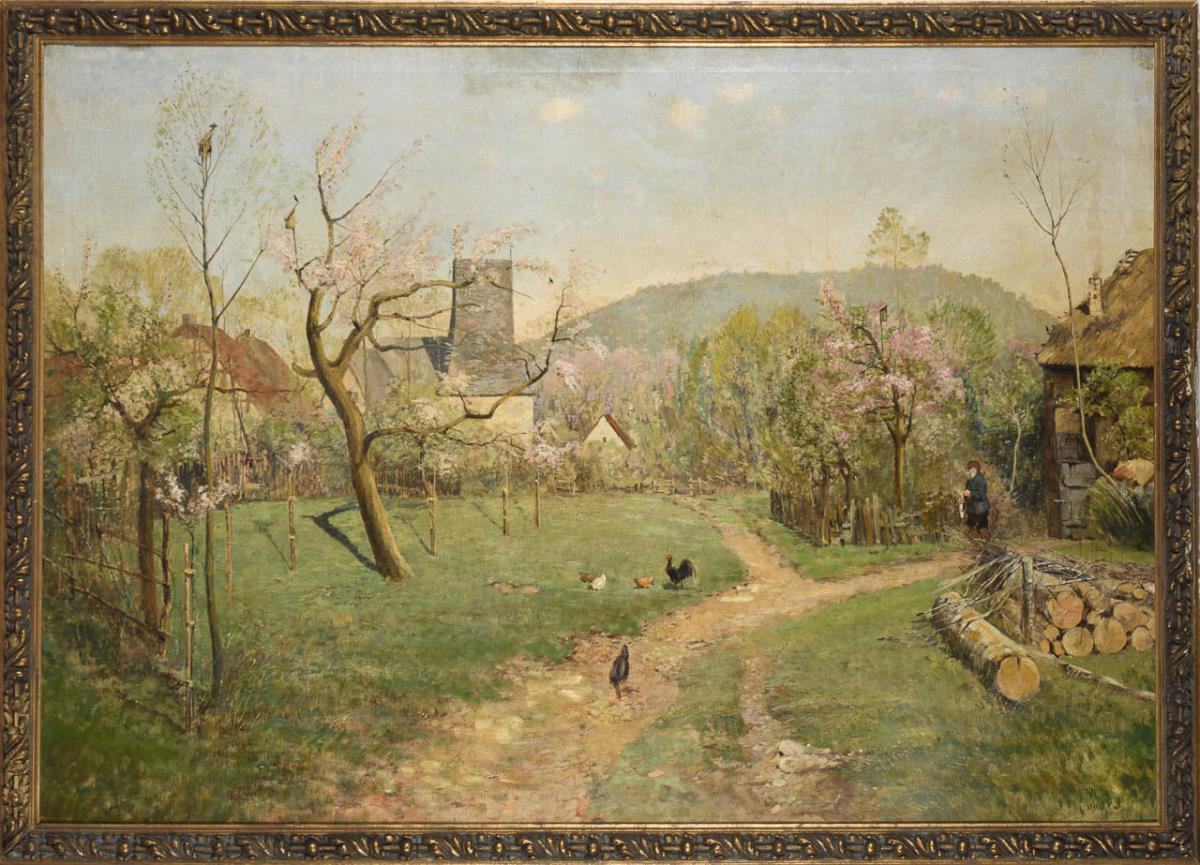 Helle Morgensonne über der Wiese mit den blühenden Obstbäumen und dem Geflügel. Das Bild erinnert deutlich an das Gemälde "Frühling im Dorf bei Weimar" von Karl Buchholz, welches um 1872 entstanden ist. Leichte Altersspuren.