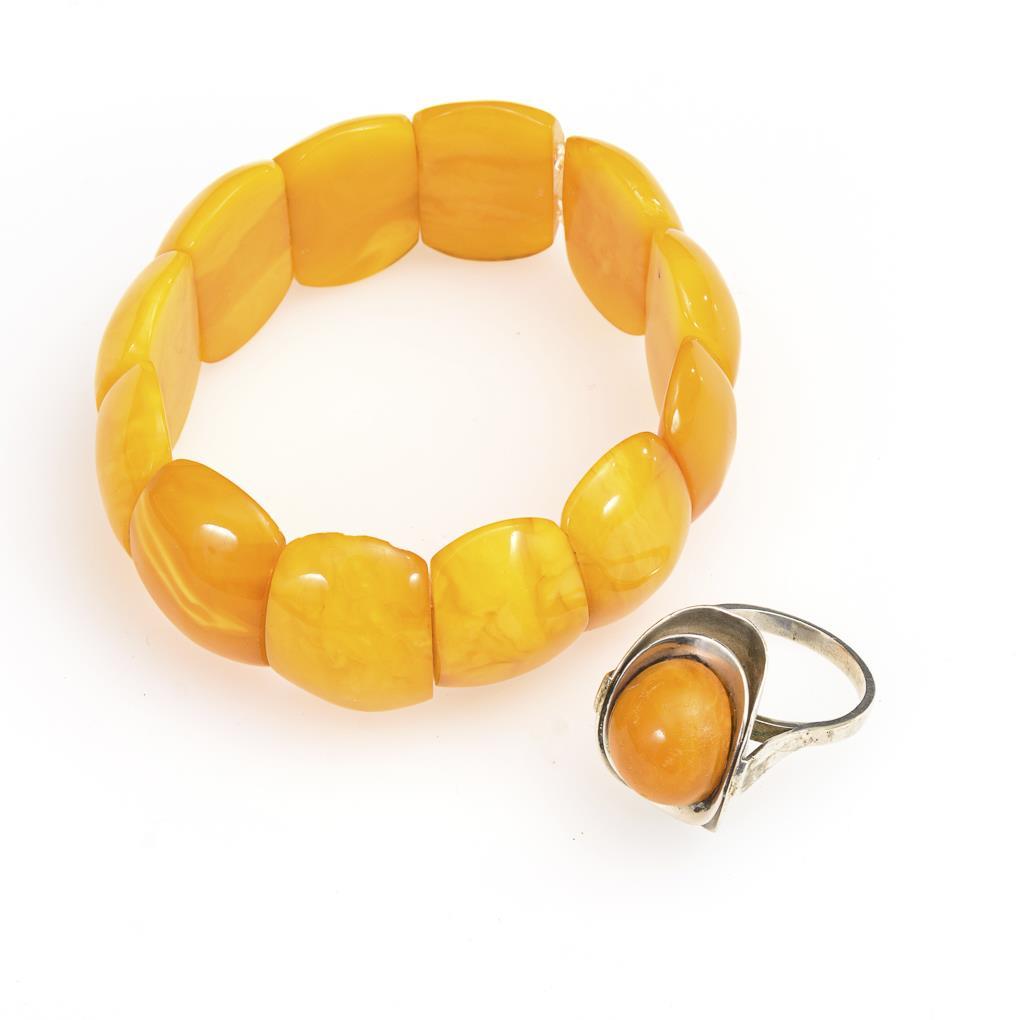 Armband aus aufgezogenen Bernsteinsegmenten. Dazu Ring mit Bernsteincabochon zwischen