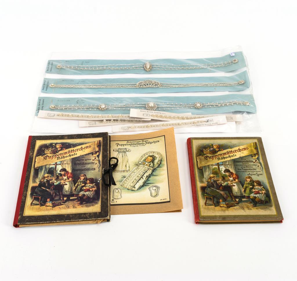 "Eine Puppengeschichte zugleich eine Anleitung nach welcher junge Mädchen ihre Puppenkleider selbständig herstellen können von Agnes Lucas". / Nachdruck? der "Schnittmuster und Pausevorrichtung" (mit Bogen Nr. 1, 2, 5, 6, 7 und 8). / Dazu 3 Ketten und 4 Armbänder der Firma "Balduin Schmidt, Annaberg, Saxony", alle auf originalen Musterkarten für den Export nach USA. 1x Nähschule mit leichten Stockflecken, 1 Blatt lose.