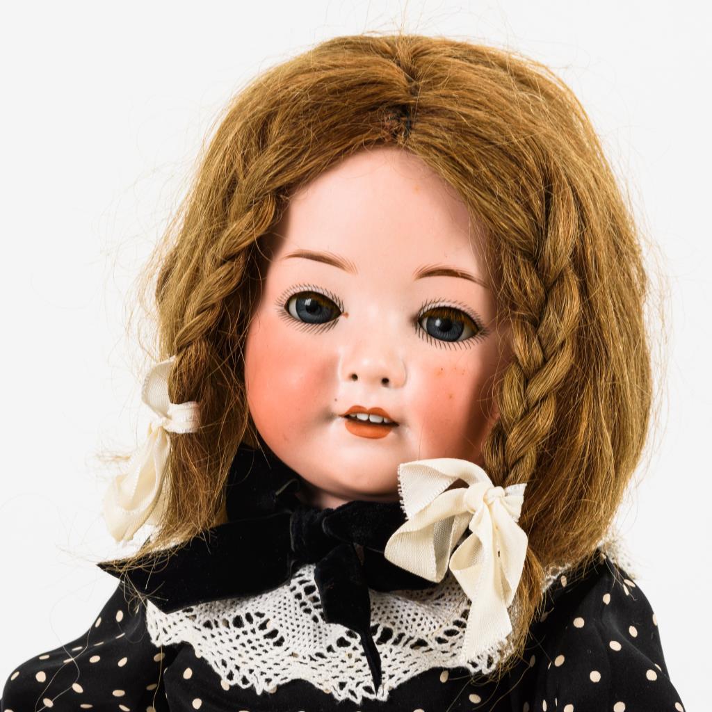 Kurbelkopf, blaue Schlafaugen, Wimpern, offener Mund, Zähnchen, offene Nasenlöcher, hellbraune Echthaarperücke. 5-teiliger Stehbabykörper. Schwarzes Kleid mit weißen Punkten, weiße Schürze. Verklebter Kopfdeckel, Kopf nicht durchleuchtet: ohne sichtbare Defekte.