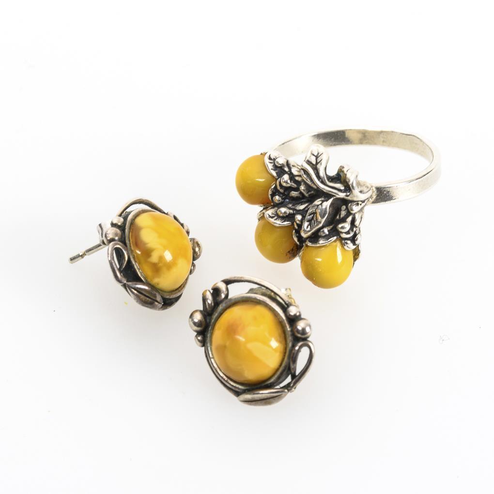 3 Bernsteincabochons, zwischen Silberzier und schmaler Schiene. Dazu Ohrsteckerpaar mit
