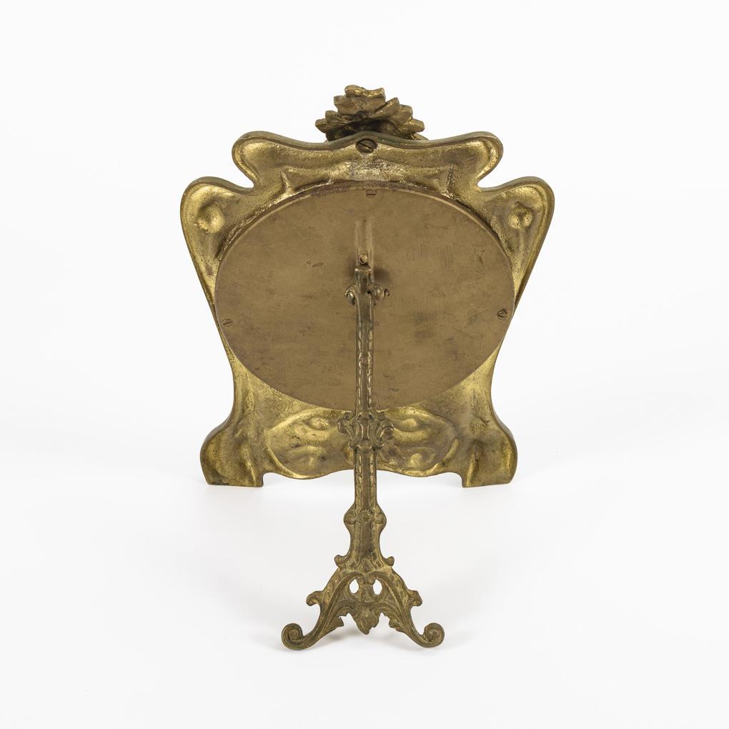 Reich reliefierter Tischspiegel mit Frauenkopf und applizierter Vase sowie Aufsteller. Spiegelglas ergänzt.